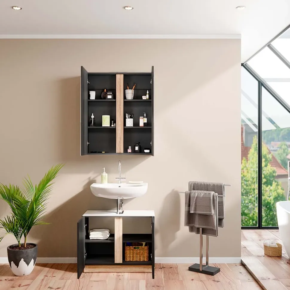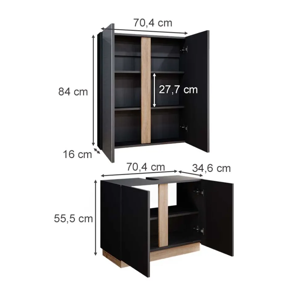 - MATERIAL: Das Set mit dem Spiegelschrank besteht aus pflegeleichter Spanplatte 16 mm, mit einer Melaminharzbeschichtung