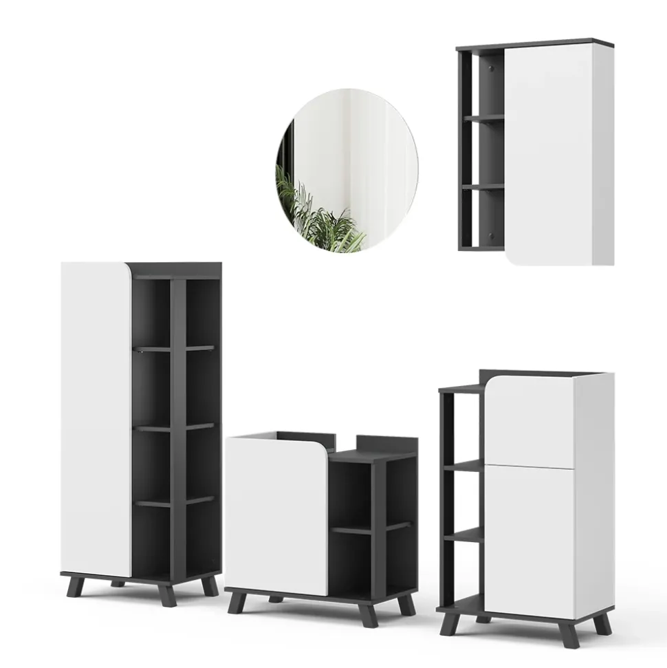 LIEFERUMFANG: Badezimmerspiegel, Midischrank, Waschbeckenunterschrank, Badregal, Hängeschrank, Montageanleitung, Montagematerial (Dekoration nicht enthalten)