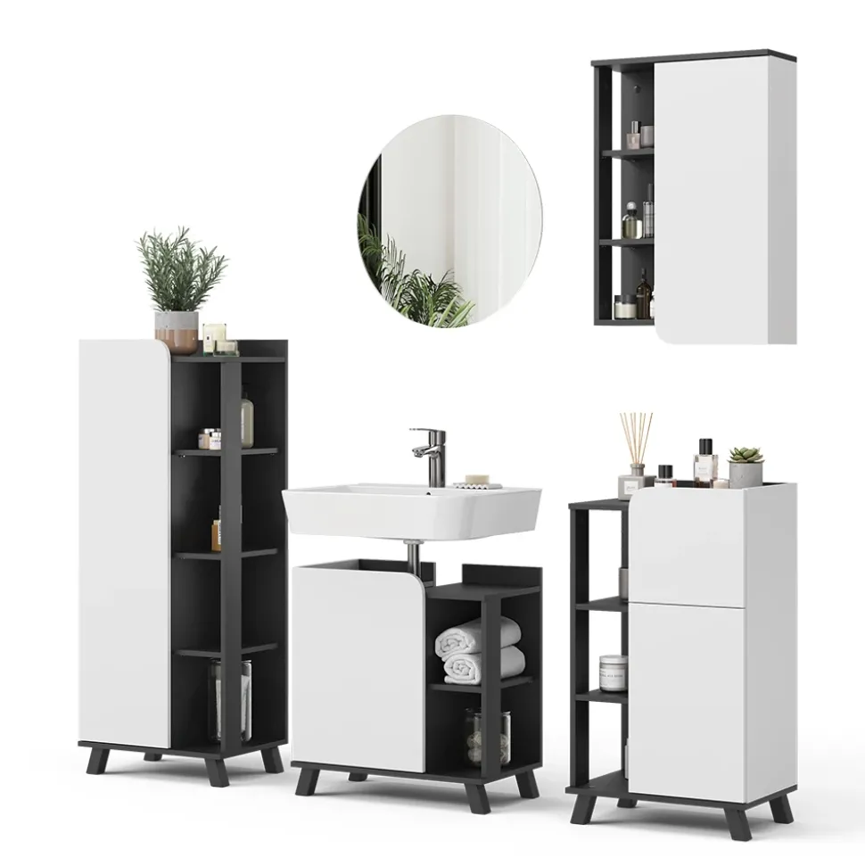 - MATERIAL: Das Badmöbel-Set besteht aus einer pflegeleichten Spanplatte, 16 mm, mit einer Melaminharzbeschichtung.