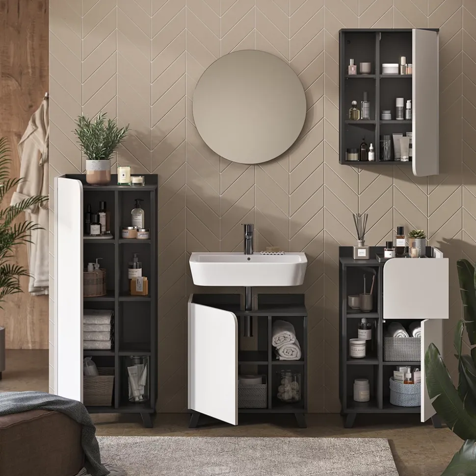 Die Möbelserie „Karen“ bietet eine umfangreiche Auswahl an Badezimmermöbeln, darunter Schränke, Spiegel und komplette Sets. Mit ihrem zeitgemäßen Design und hochwertigen Materialien schafft „Karen“ eine ästhetische und funktionale Umgebung in Ihrem Badezimmer, die sowohl Stil als auch praktischen Nutzen vereint.