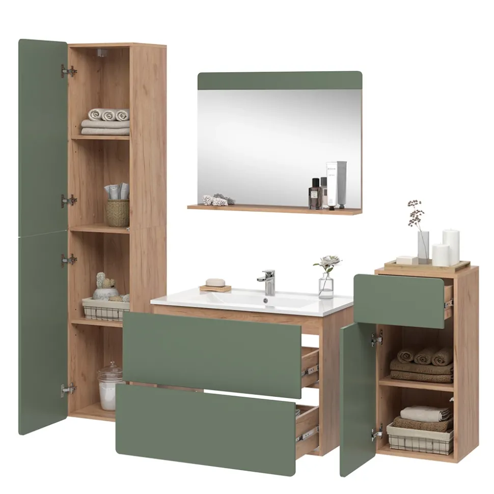 - LIEFERUMFANG: Waschbeckenunterschrank inkl. Waschbecken, Badspiegel, Hochschrank, Midischrank, Montageanleitung, Montagematerial (Dekoration nicht enthalten)