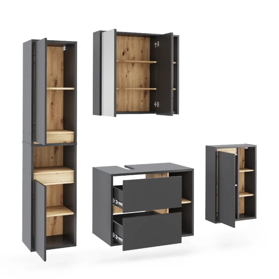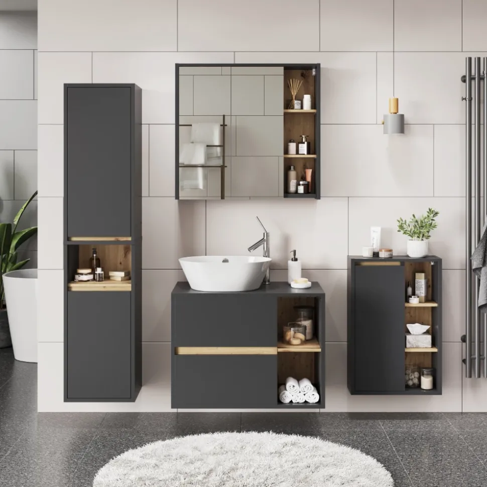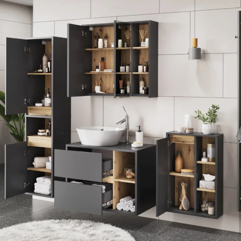 Das Badmöbel-Set Viola bietet alles, was Sie für ein stilvolles und funktionales Badezimmer benötigen. Mit Waschbeckenunterschrank und Spiegelschrank können Sie Ihr Bad perfekt organisieren und eine entspannte Atmosphäre schaffen. Hochwertiges Design und durchdachte Aufteilung sorgen für Ordnung und Komfort. Verwandeln Sie Ihr Badezimmer mit dem Viola Badmöbel-Set in eine Oase der Entspannung und genießen Sie jeden Moment in Ihrem persönlichen Wellnessbereich. Gönnen Sie sich und Ihrem Zuhause das Beste – investieren Sie in das Viola Badmöbel-Set.
