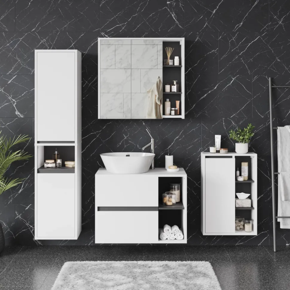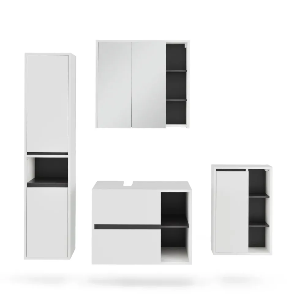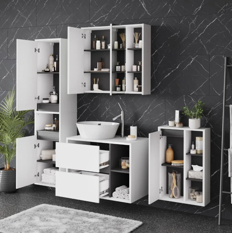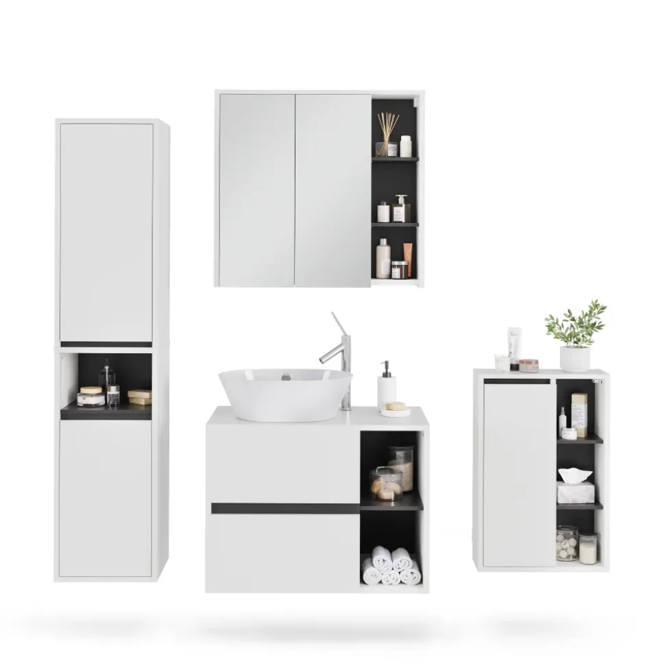 Das Badmöbel-Set Viola bietet alles, was Sie für ein stilvolles und funktionales Badezimmer benötigen. Mit Waschbeckenunterschrank und Spiegelschrank können Sie Ihr Bad perfekt organisieren und eine entspannte Atmosphäre schaffen. Hochwertiges Design und durchdachte Aufteilung sorgen für Ordnung und Komfort. Verwandeln Sie Ihr Badezimmer mit dem Viola Badmöbel-Set in eine Oase der Entspannung und genießen Sie jeden Moment in Ihrem persönlichen Wellnessbereich. Gönnen Sie sich und Ihrem Zuhause das Beste – investieren Sie in das Viola Badmöbel-Set.