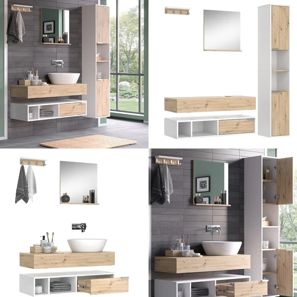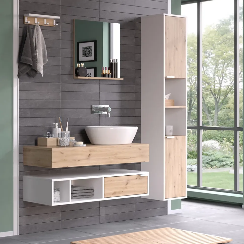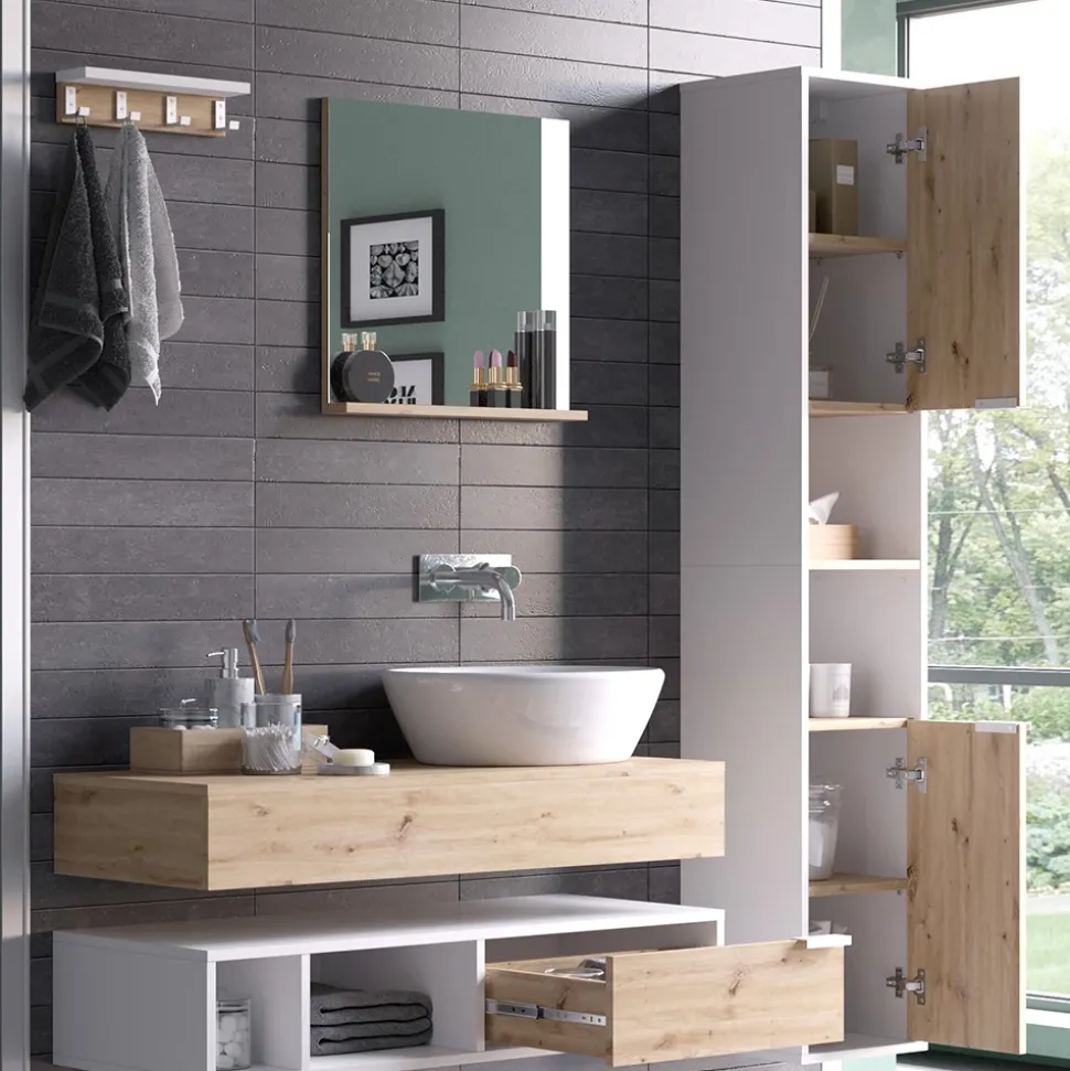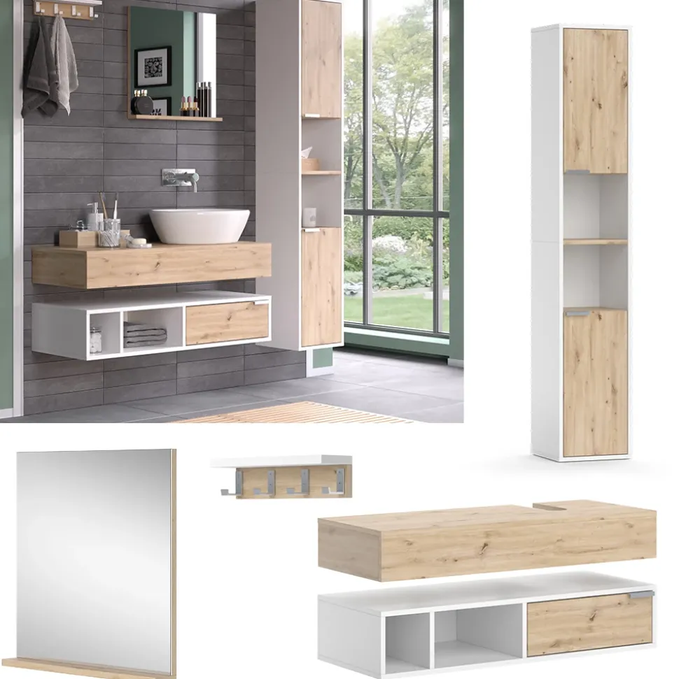 - Entdecken Sie das elegante Badmöbel-Set Henri in Weiß-Artisan mit Spiegel, Regal, Waschtisch und Hochschrank. Diese Badmöbelkollektion bietet stilvollen Stauraum mit Schubladen und Ablagen.