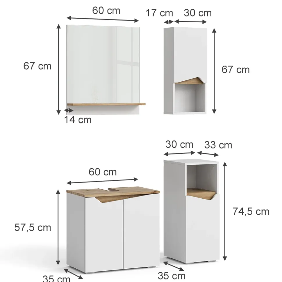 - PRODUKTMAßE: Badspiegel: 60 x 67 x 14 cm (BxHxT), 8,2 kg. Waschtischunterschrank: 60 x 57,5 x 35 cm (BxHxT), 12,9 kg.