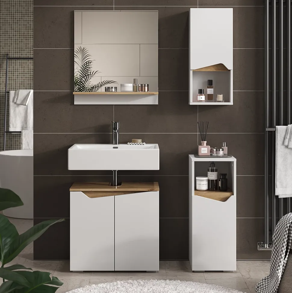 Vervollständigen Sie Ihr Badezimmer mit unserem exklusiven Badmöbel-Set, das Eleganz und Funktionalität in einem bietet. Unser zeitgemäßes Design verleiht Ihrem Badezimmer eine stilvolle Note, die sich nahtlos in Ihre Einrichtung einfügt. Die Oberfläche ist mühelos zu reinigen, sodass Ihr Badezimmer immer strahlend und einladend bleibt. Dank unserer benutzerfreundlichen Anleitung gestaltet sich die Montage unkompliziert, sodass Sie Ihr neues Badmöbel-Set schnell genießen können.