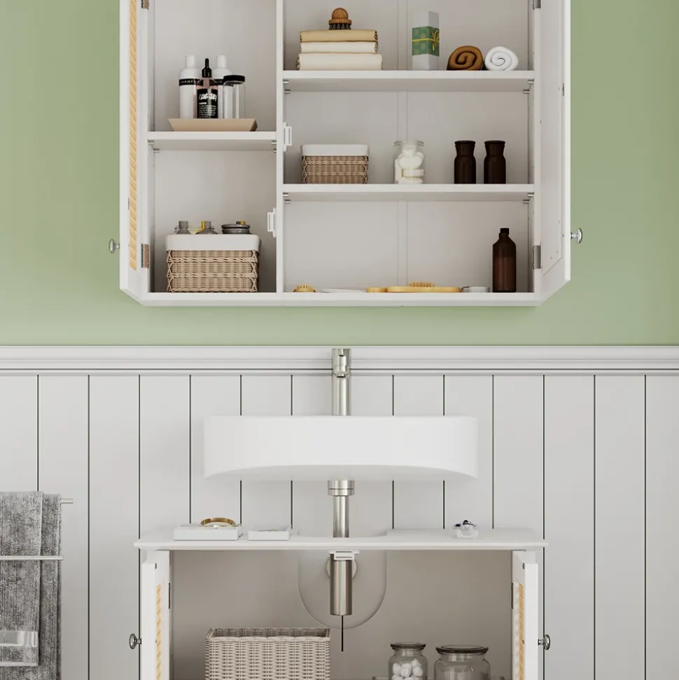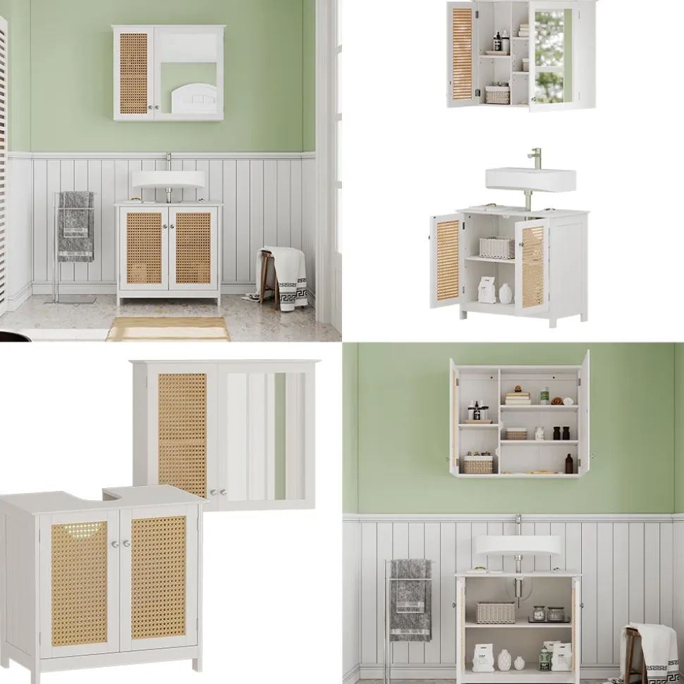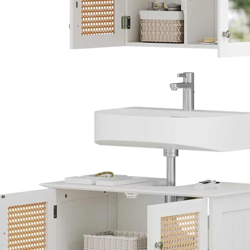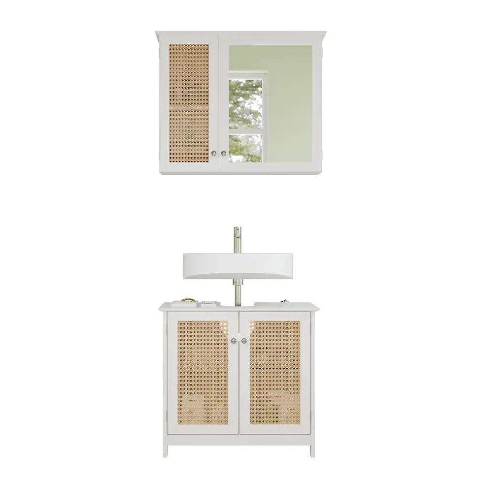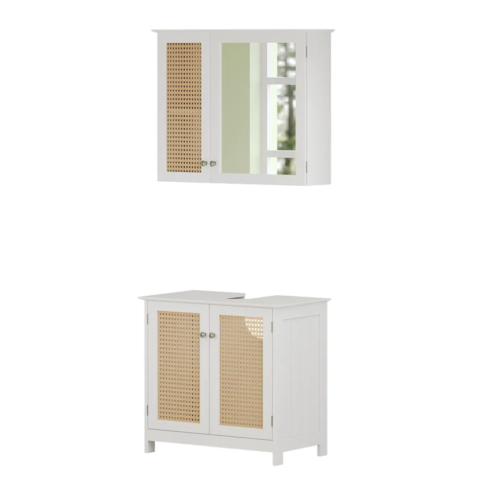 Erleben Sie den Charme des Badmöbel-Sets: Die Rattangeflecht-Tür mit Lochmuster verleiht Ihrem Badezimmer eine unvergleichliche Eleganz. Maximieren Sie den Stauraum für eine organisierte Umgebung – die perfekte Lösung für all Ihre Badezimmerbedürfnisse. Sparen Sie Zeit mit einer mühelosen Montage, um schnell von Ihren neuen, stilvollen Möbeln zu profitieren. Die pflegeleichte Oberfläche bewahrt die Schönheit und ermöglicht eine einfache Reinigung, um den Glanz Ihrer Möbel zu bewahren.