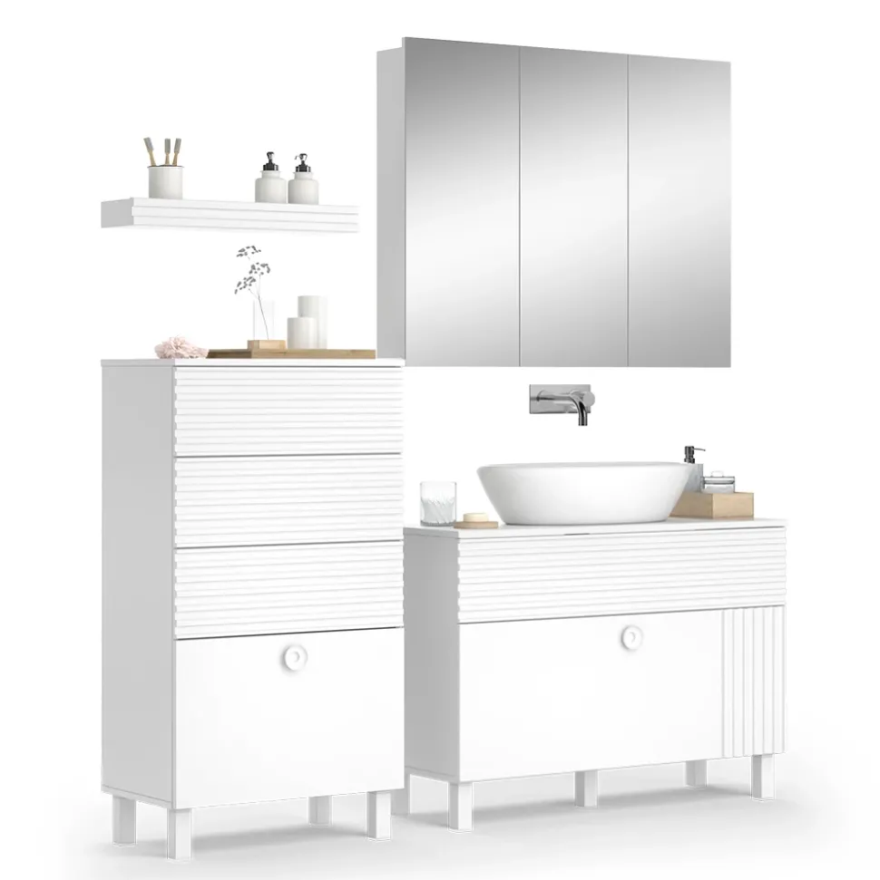 - Entdecken Sie unser stilvolles Badmöbel-Set Sola Weiß matt. Diese Kollektion umfasst Waschtischunterschrank, Spiegelschrank, Midischrank und Regal – perfekter Stauraum für Ihr Bad.