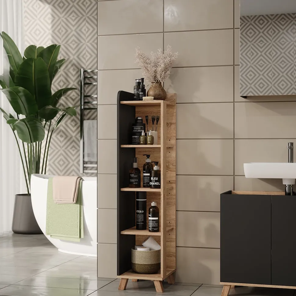 Der Badregal Karen ist die perfekte Lösung, um Ordnung und Stil in Ihr Badezimmer zu bringen. Mit seinen 4 geräumigen Fächern bietet er ausreichend Platz für all Ihre Badezimmerutensilien, von Handtüchern bis hin zu Kosmetika. Dieser Badschrank kann perfekt mit anderen Möbeln kombiniert werden und sorgt so für ein einheitliches und harmonisches Erscheinungsbild in Ihrem Badezimmer. Gönnen Sie sich mit dem Midischrank Karen ein Stück Luxus für Ihr Zuhause und genießen Sie die einfache Organisation Ihrer persönlichen Pflegeprodukte.