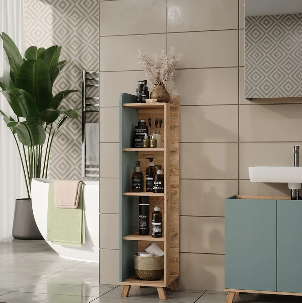 Der Badregal Karen ist die perfekte Lösung, um Ordnung und Stil in Ihr Badezimmer zu bringen. Mit seinen 4 geräumigen Fächern bietet er ausreichend Platz für all Ihre Badezimmerutensilien, von Handtüchern bis hin zu Kosmetika. Dieser Badschrank kann perfekt mit anderen Möbeln kombiniert werden und sorgt so für ein einheitliches und harmonisches Erscheinungsbild in Ihrem Badezimmer. Gönnen Sie sich mit dem Midischrank Karen ein Stück Luxus für Ihr Zuhause und genießen Sie die einfache Organisation Ihrer persönlichen Pflegeprodukte.