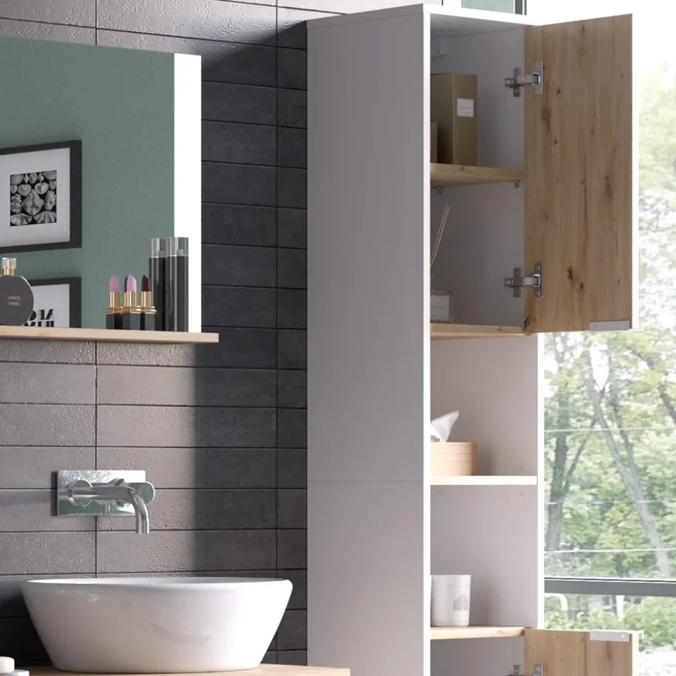 - Entdecken Sie den Vicco Hochschrank Henri in Weiß-Artisan – ein eleganter Badezimmerschrank, der Funktionalität und Stil in Ihr Badezimmer bringt.