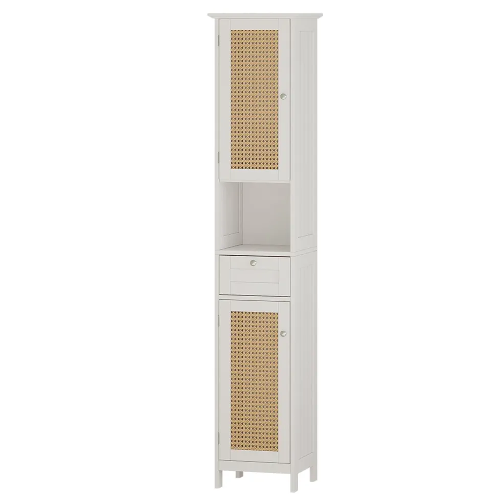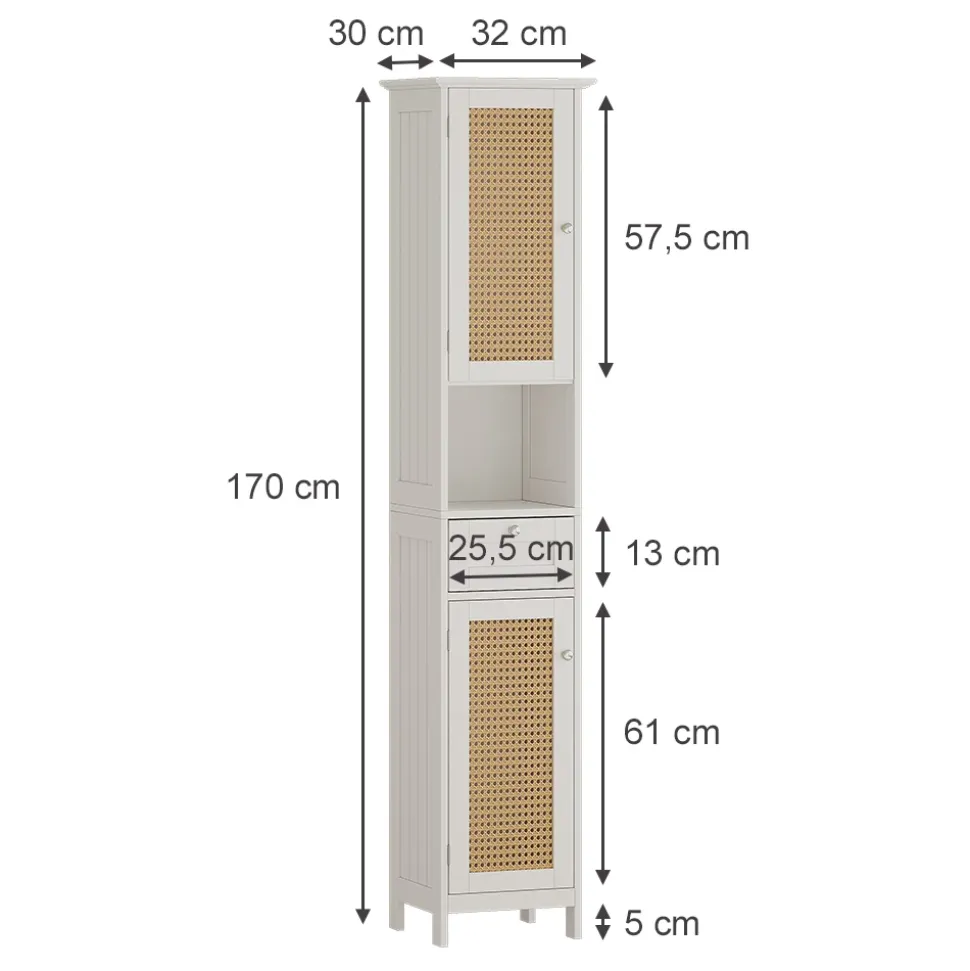 Als Teil der Serie Rosario verleiht der Hochschrank Ihrem Badezimmer Eleganz. Das Türdekor mit Rattangeflecht im Lochmuster setzt stilvolle Akzente. Viel Stauraum für Handtücher und Kosmetik – der schmale Schrank ist eine praktische Ergänzung. Nutzen Sie den Raum optimal aus. Die einfache Montage macht das Aufstellen zum Kinderspiel. Folgen Sie der beiliegenden Anleitung und genießen Sie Ihren neuen Schrank im Handumdrehen. Dank der pflegeleichten Oberfläche behält der Hochschrank seine Schönheit. Leichte Reinigung garantiert langanhaltende Freude an diesem Badmöbelstück.
