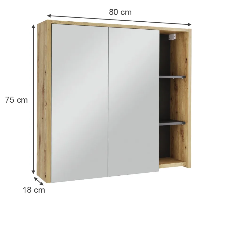 - MAßE: Der Badezimmerschrank mit Spiegel misst 80 cm in der Breite, 75 cm in der Höhe und 18 cm in der Tiefe.