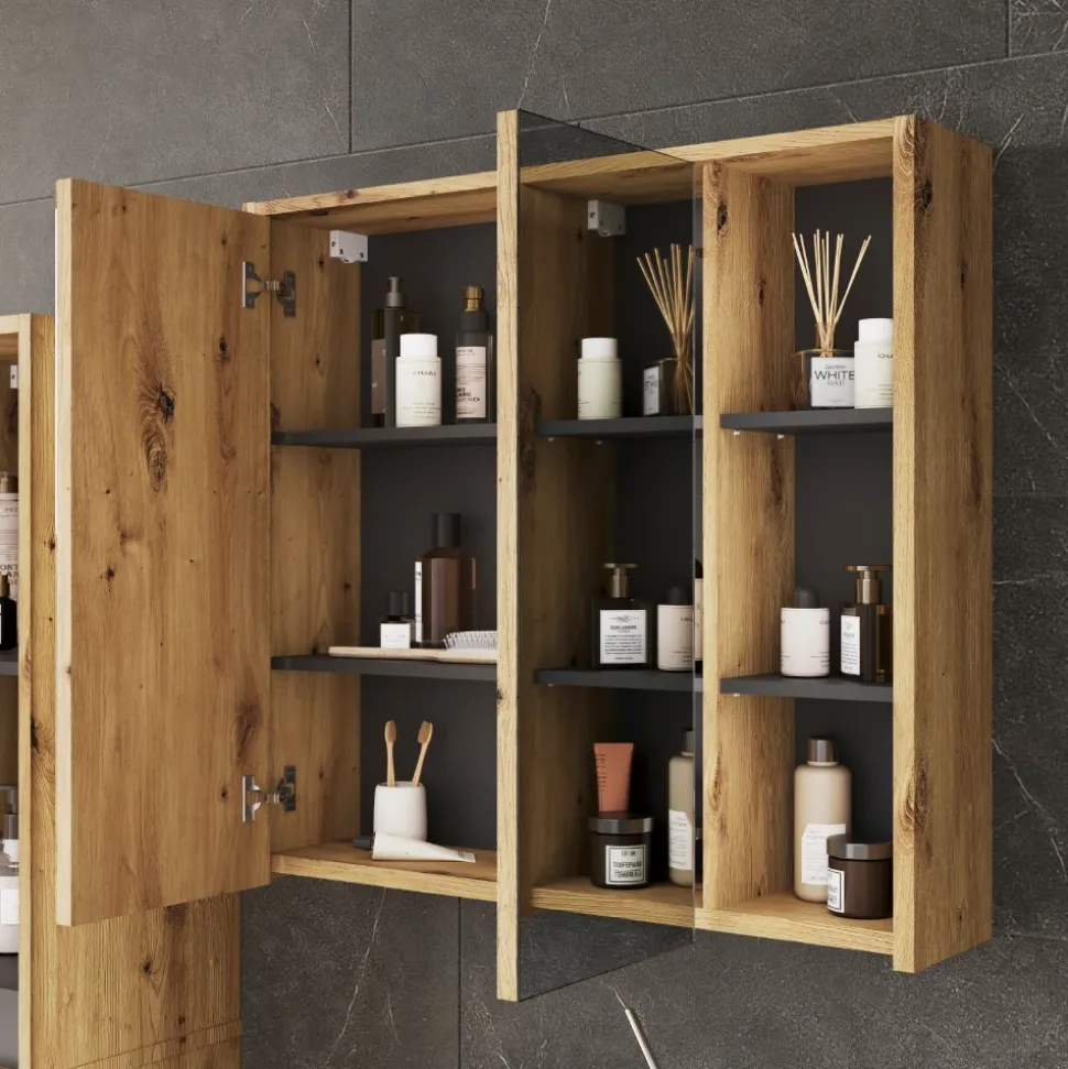Der Badspiegelschrank Viola ist nicht nur praktisch, sondern auch ein echter Hingucker. Mit zwei Spiegeltüren und insgesamt neun Fächern bietet er großzügigen Stauraum für Pflegeprodukte und Accessoires. Die Kombination aus offenen und geschlossenen Fächern sorgt für Ordnung und Übersicht. Dank seines modernen Designs fügt sich der Schrank nahtlos in jedes Badezimmer ein und verleiht ihm eine elegante Note. Entdecken Sie mit Viola eine neue Dimension von Stil und Funktionalität.