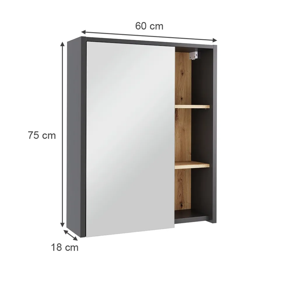 - MAßE: Der Badezimmerschrank mit Spiegel misst 60 cm in der Breite, 75 cm in der Höhe und 18 cm in der Tiefe.