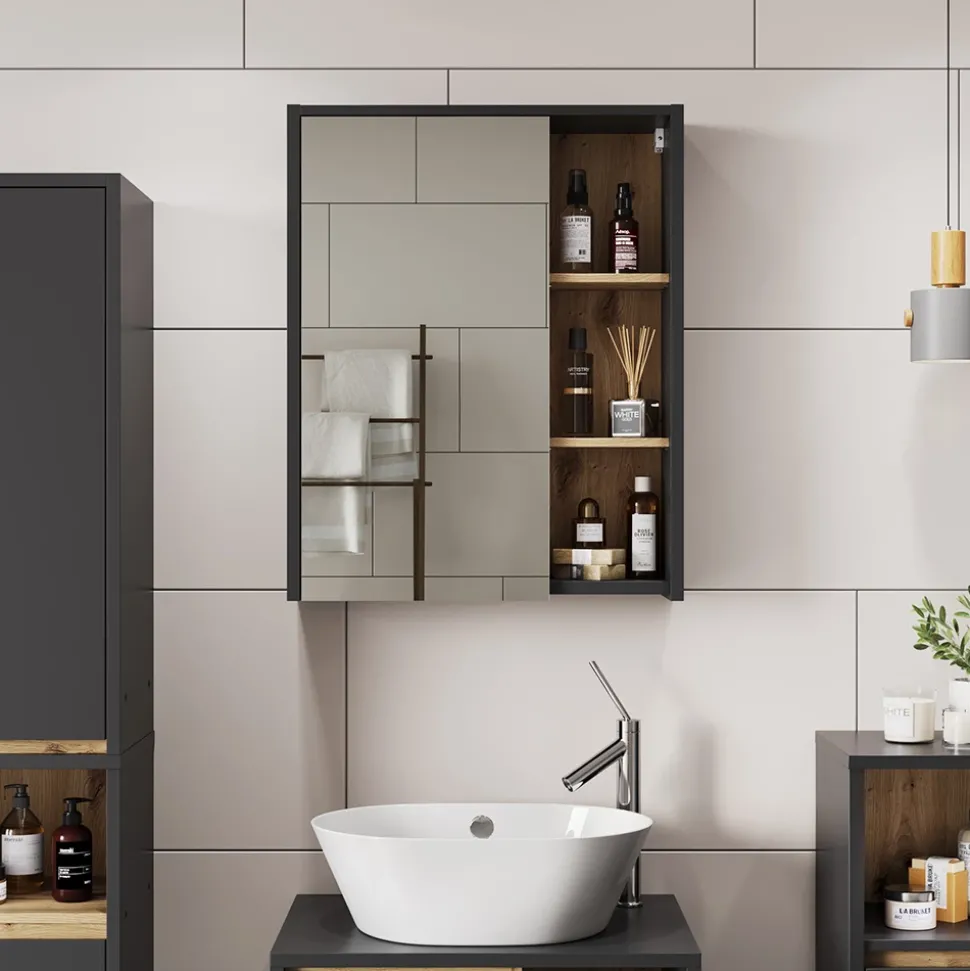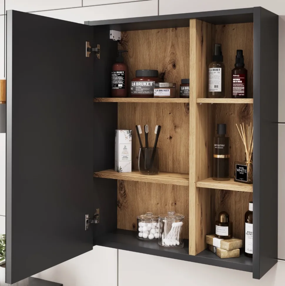 - Der moderne Badezimmerspiegel bietet drei offene und drei geschlossene Fächer – praktischer Stauraum in einem Design, das Funktionalität und Ästhetik vereint.