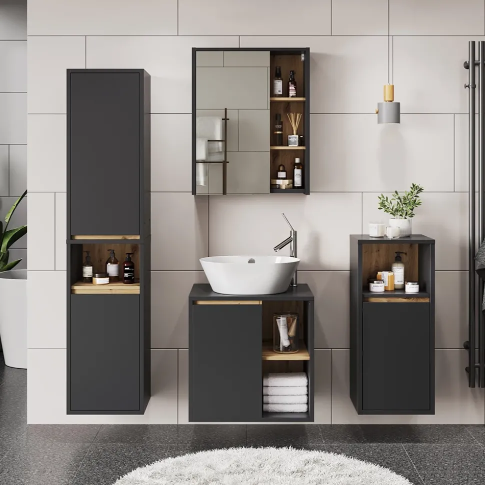 Der Badspiegelschrank „Viola“ vereint modernes Design mit praktischer Funktion. Mit einer Spiegeltür, drei offenen und drei geschlossenen Fächern bietet er viel Stauraum für Ihre Badutensilien. Offene Fächer ermöglichen schnellen Zugriff, geschlossene sorgen für Ordnung. Verleihen Sie Ihrem Badezimmer mit „Viola“ einen frischen, stilvollen Look – für mehr Übersicht und Wohlgefühl im Alltag.