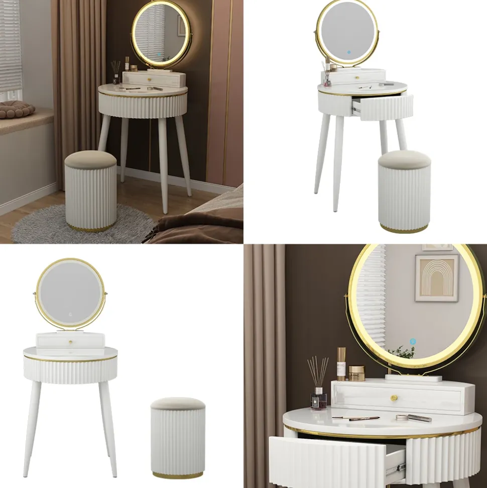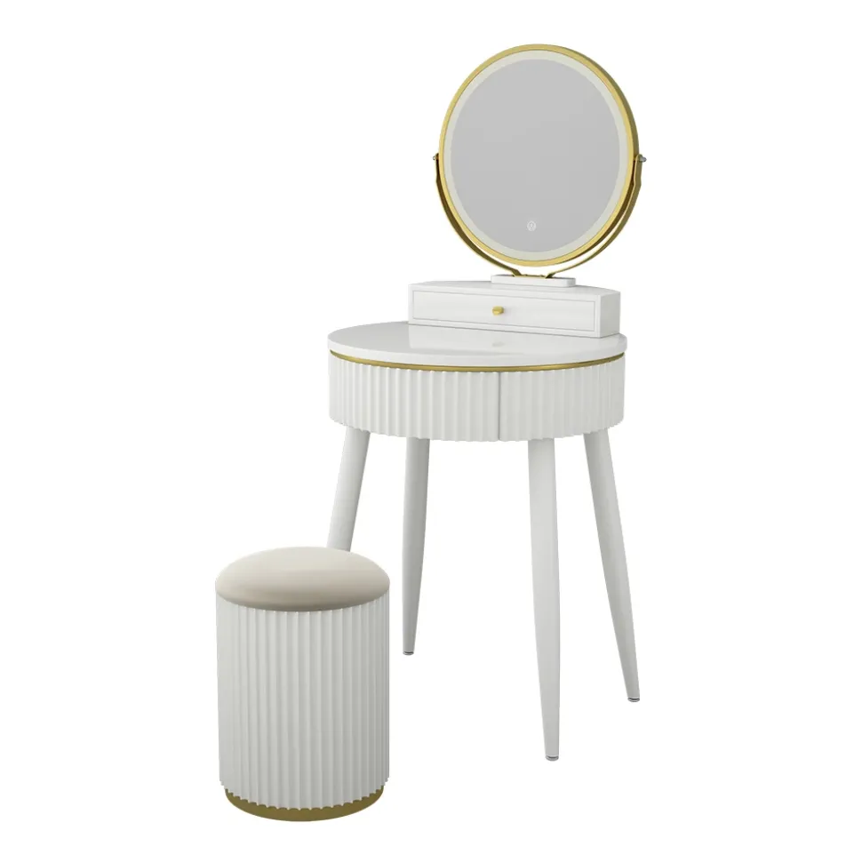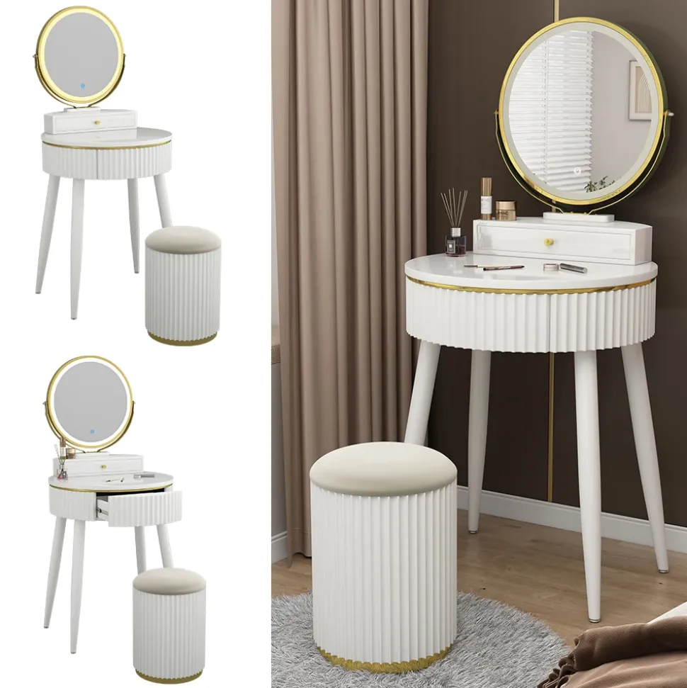 - Der LED-Spiegel des Schminktisches verfügt über drei verschiedene, einstellbarere Helligkeits-Stufen. Außerdem verfügt er über zwei Schubladen.