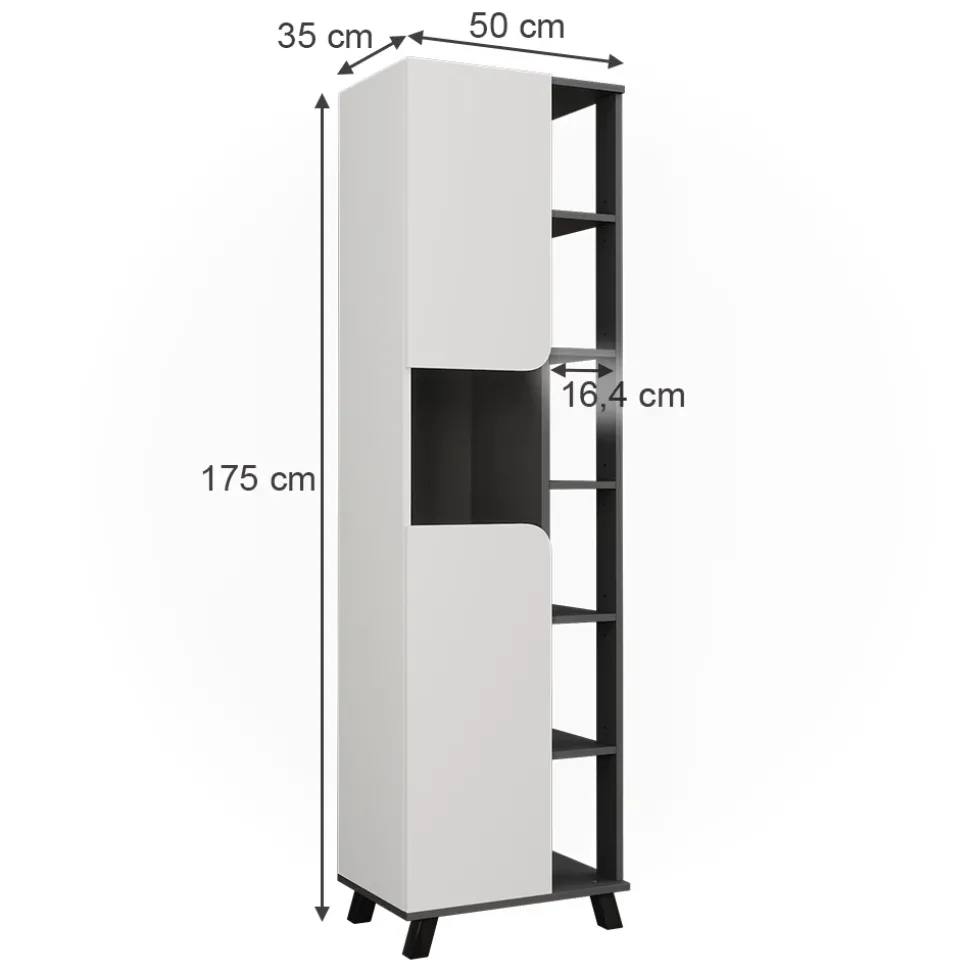 - MAßE: Der Hochschrank, mit 2 Türen, hat eine Tiefe von 35 cm, eine Breite von 50 cm und eine Höhe von 175 cm.