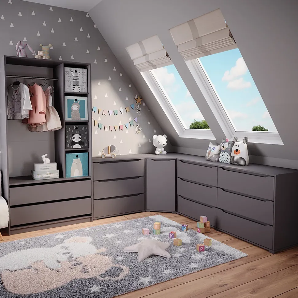 Der Kinderkleiderschrank Elmo ist ein funktionaler und geräumiger Begleiter für jedes Kinderzimmer. Mit zwei Schubladen und vier offenen Regalen bietet er viel Platz für die Kleidung der Kleinen und sorgt für Ordnung im Zimmer. Durch sein zeitloses und funktionales Design passt er perfekt zu jeder Einrichtung und kann mit anderen Möbelstücken kombiniert werden. Mit dem Kinderkleiderschrank Elmo schaffen Sie einen Ort, an dem sich Ihr Kind zu Hause fühlt.
