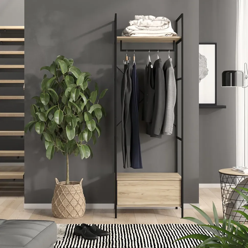 Die Standgarderobe Enya kombiniert Eiche und Metall zu einem modernen, funktionalen Design. Sie verfügt über eine praktische Ablagefläche und eine Kleiderstange, ideal für Flur oder Schlafzimmer, um Mäntel und Accessoires stilvoll zu organisieren.
