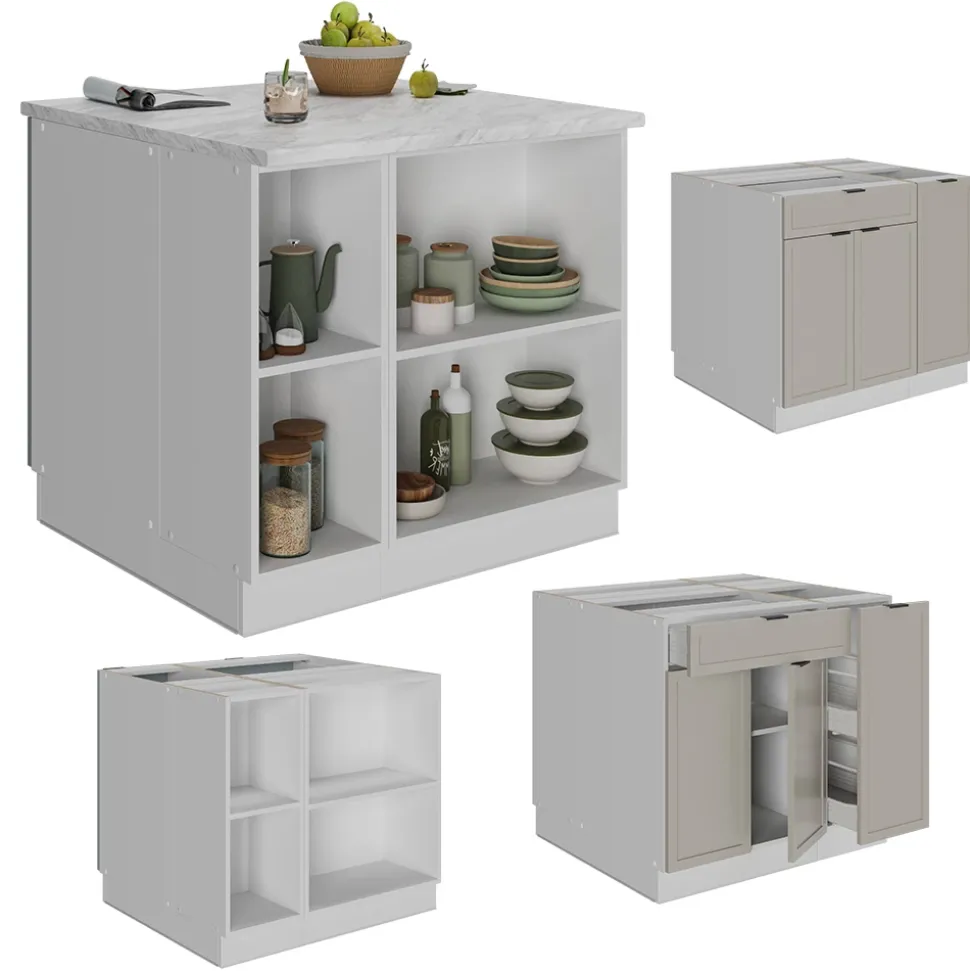 - MAßE: Der Insel-Küchenschrank hat eine Breite von 90 cm, eine Höhe von 82 cm und eine Tiefe von 82 cm. Alle detaillierten Größen sind auf den Fotos angegeben.