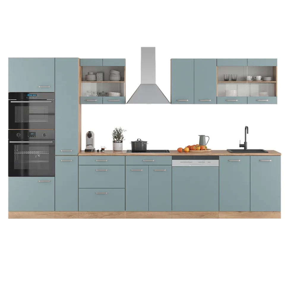 - MAßE: Die Einbauküche mit Hochschrank hat eine Breite von 350 cm, eine Höhe von 206,8 cm und eine Tiefe von 57,2 cm. Alle detaillierten Größen sind auf den Fotos angegeben