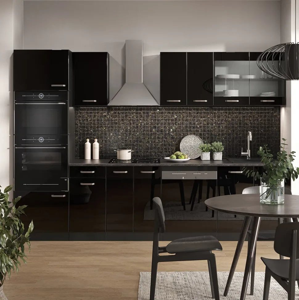 - MAßE: Die Küchenzeile mit Hochschrank hat eine Breite von 300 cm, eine Höhe von 206,8 cm und eine Tiefe von 57,2 cm. Alle detaillierten Größen sind auf den Fotos angegeben