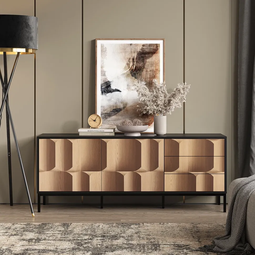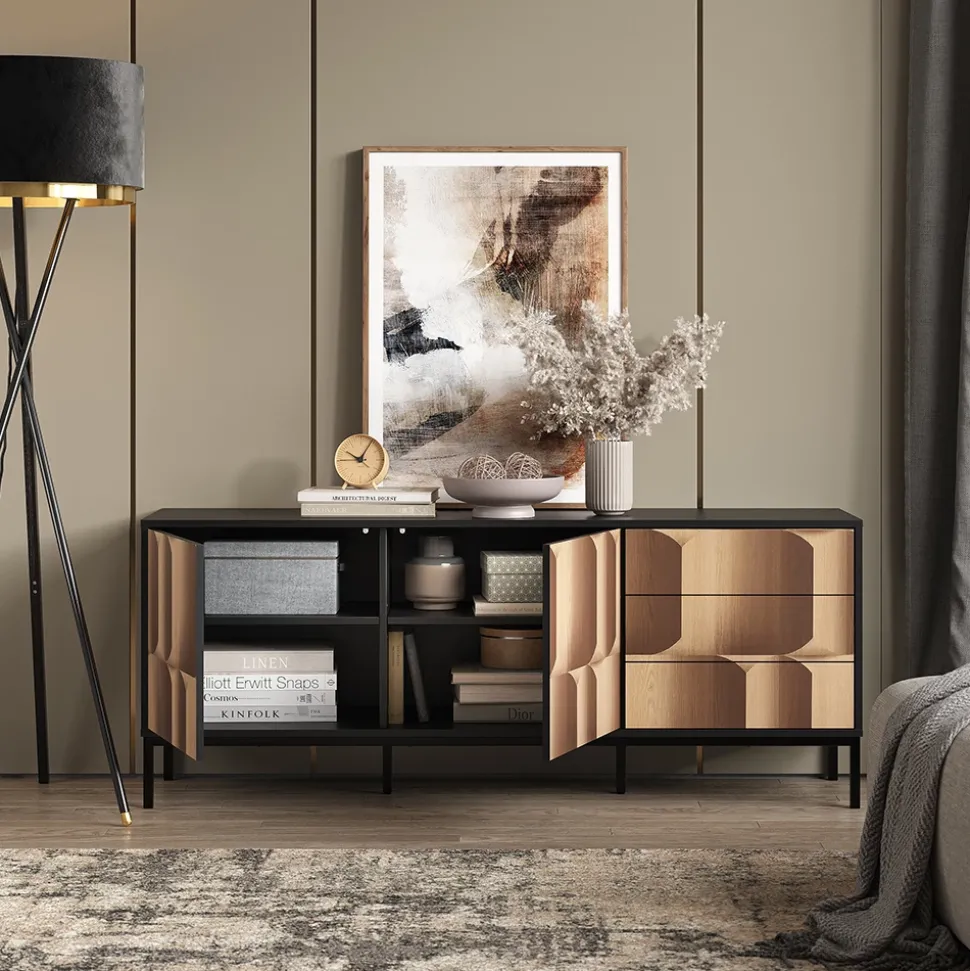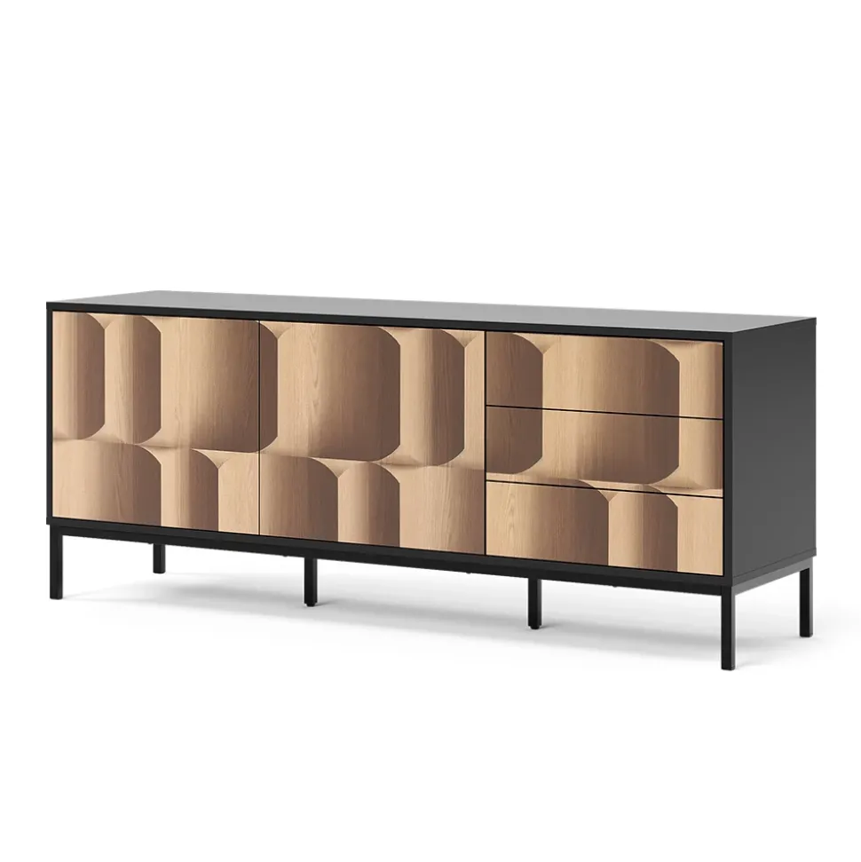 Das Lowboard Eliza ist nicht nur ein praktisches Möbelstück für Ihren Wohnbereich, sondern auch ein echter Hingucker. Mit seinen drei Schubkästen und zwei Einlegeböden bietet es ausreichend Stauraum für Ihre elektronischen Geräte und Zubehör. Der 3D-Look verleiht dem TV Schrank eine moderne Note, während das Push-to-open-System für ein einfaches Öffnen und Schließen sorgt. Stellen Sie sich vor, wie Sie gemütlich auf der Couch sitzen, Ihre Lieblingsserie läuft im Fernsehen und alles, was Sie brauchen, ist griffbereit im Lowboard Eliza verstaut. Gönnen Sie sich diesen Komfort und verschönern Sie Ihr Zuhause mit diesem stilvollen Möbelstück.