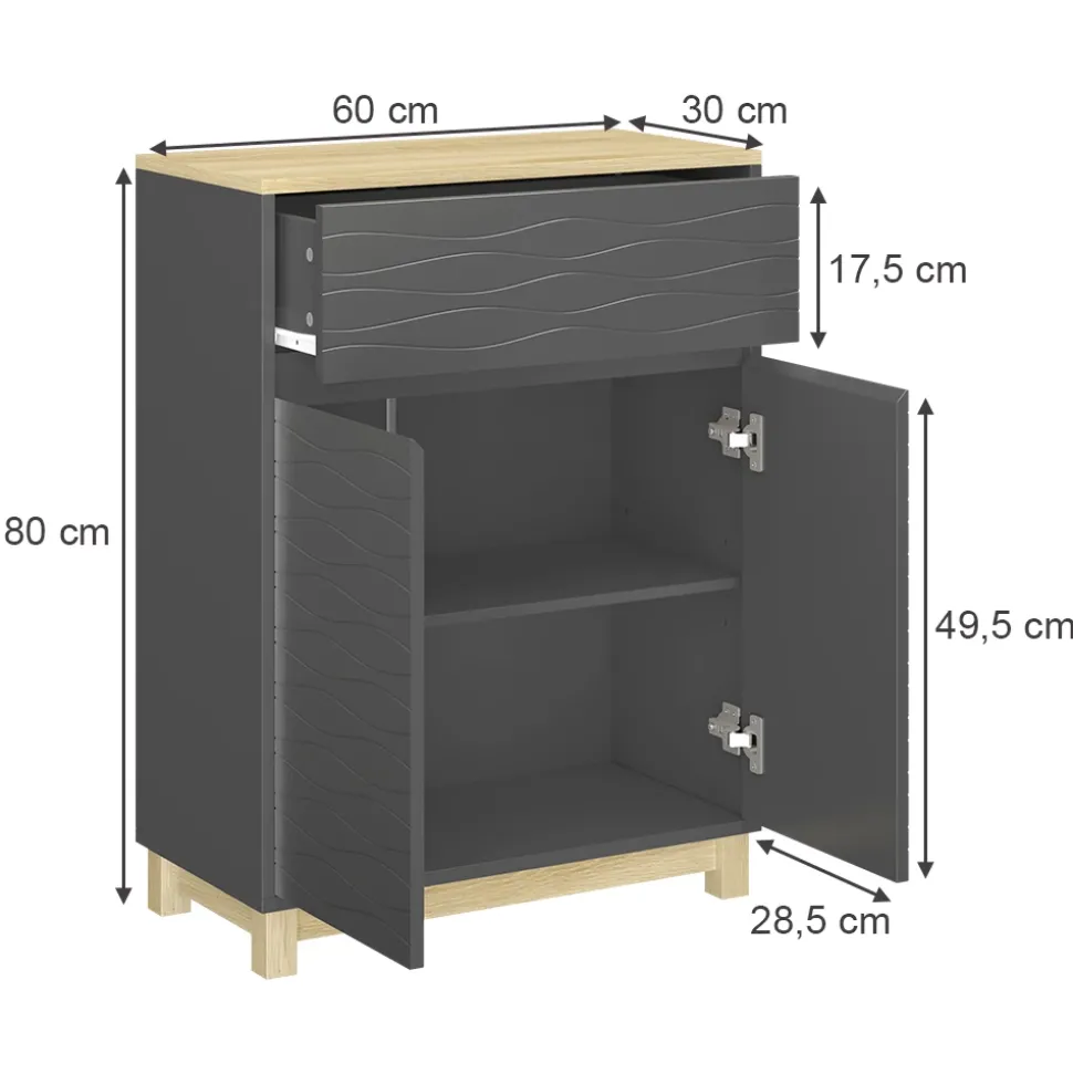 - MAßE: Badschrank mit Schublade hat die folgenden Maße: Tiefe 30 cm, Breite 60 cm, Höhe 80 cm.