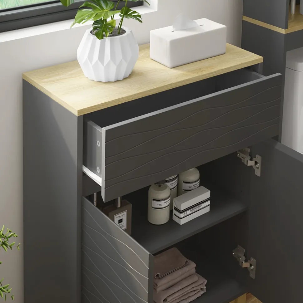 Der Toilettenschrank Livia kombiniert stilvolles Design mit praktischer Funktionalität. Mit seinen großzügigen Stauraummöglichkeiten und der natürlichen Farbgebung bringt er Ordnung und Wärme in jedes Badezimmer.