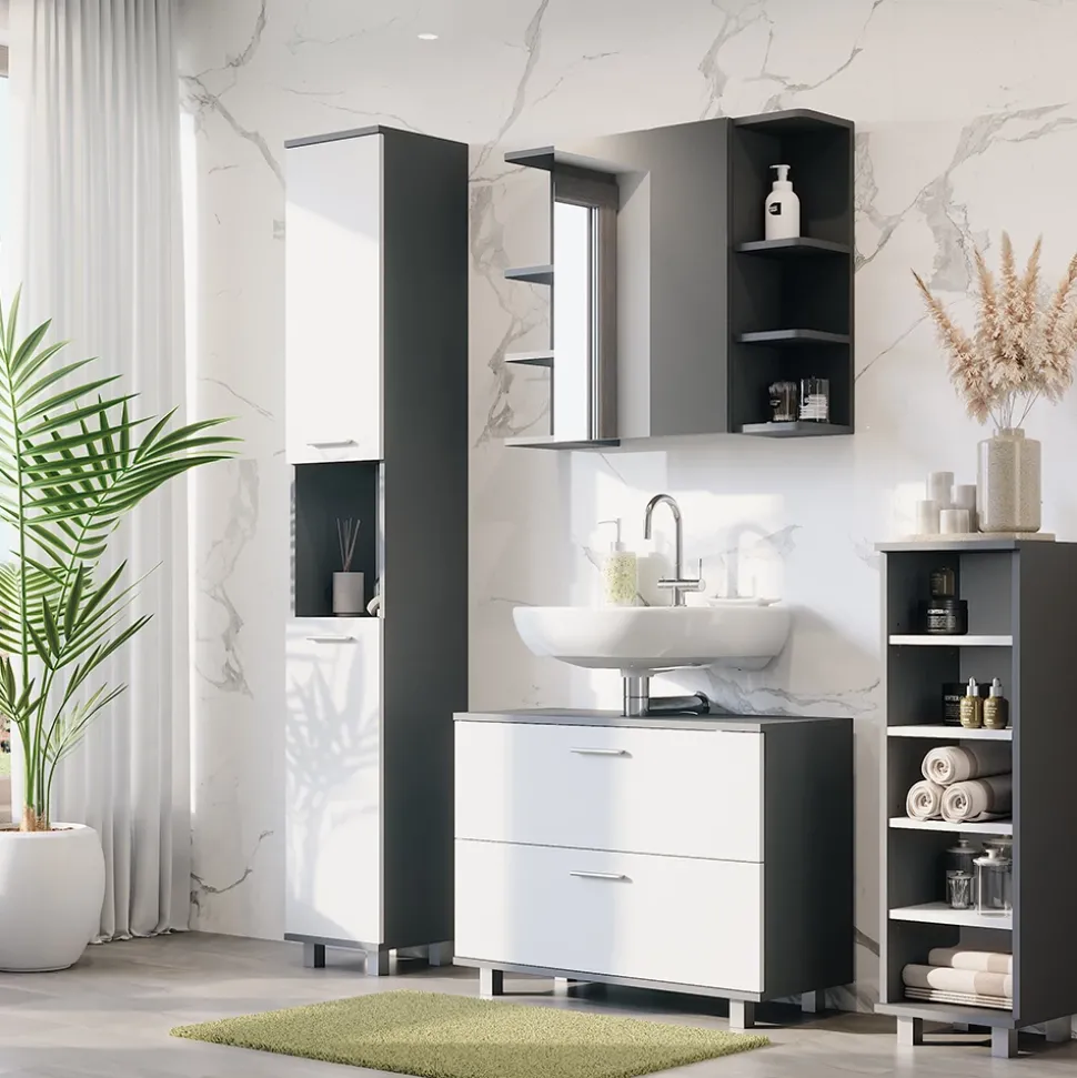 - Die Badmöbel überzeugen mit modernem Design und hochwertiger Verarbeitung. Sie bieten viel Stauraum und sind eine praktische Ergänzung für jedes Badezimmer.