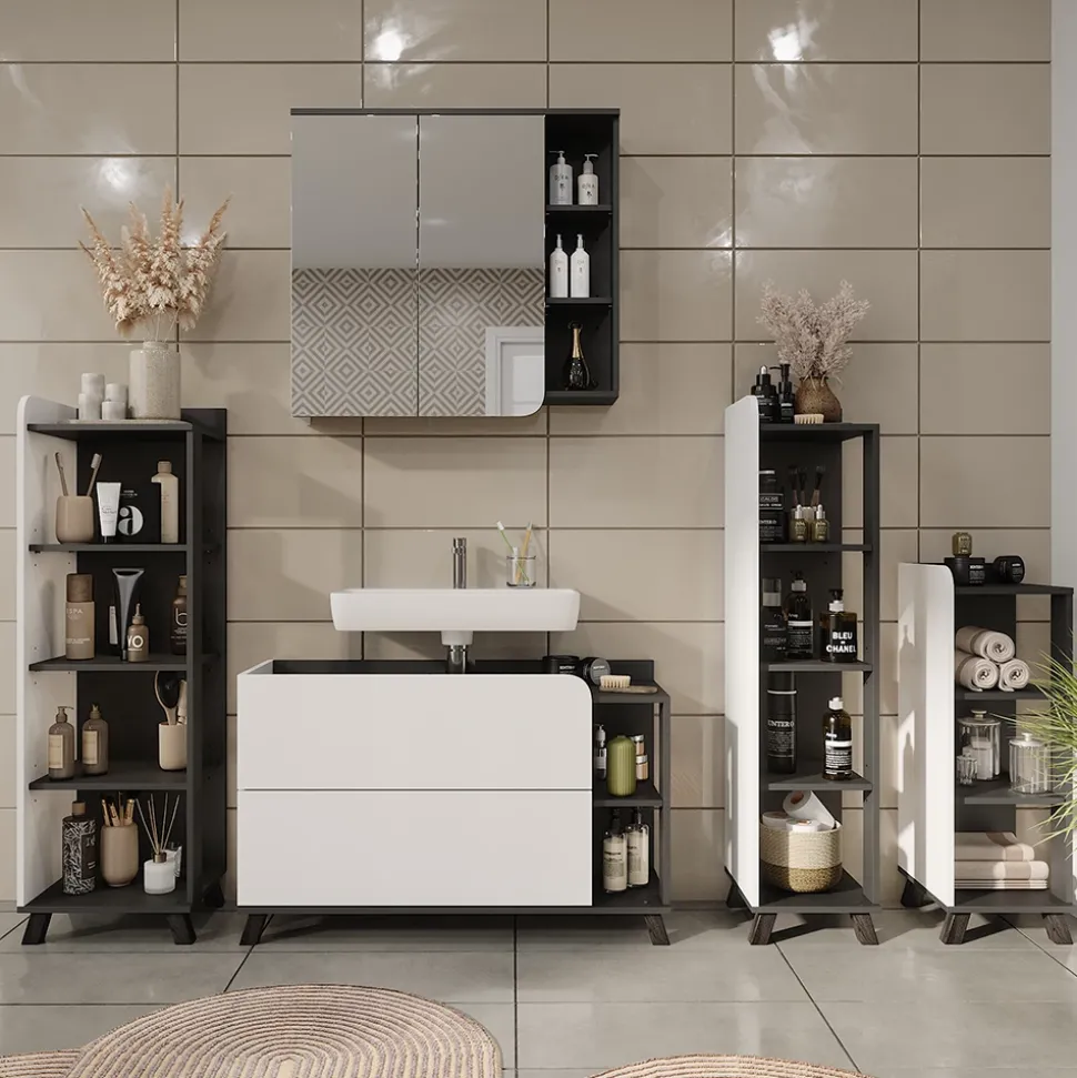 Die Möbelserie „Karen“ bietet eine umfangreiche Auswahl an Badezimmermöbeln, darunter Schränke, Spiegel und komplette Sets. Mit ihrem zeitgemäßen Design und hochwertigen Materialien schafft „Karen“ eine ästhetische und funktionale Umgebung in Ihrem Badezimmer, die sowohl Stil als auch praktischen Nutzen vereint.