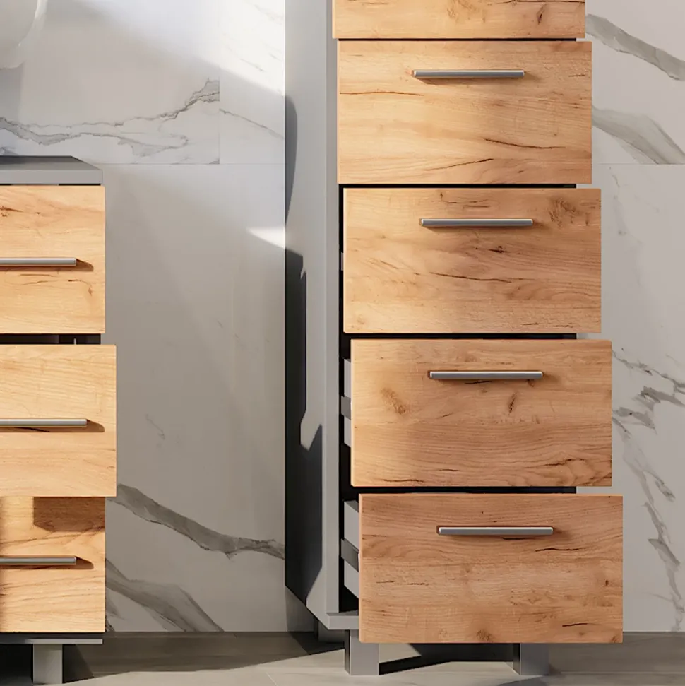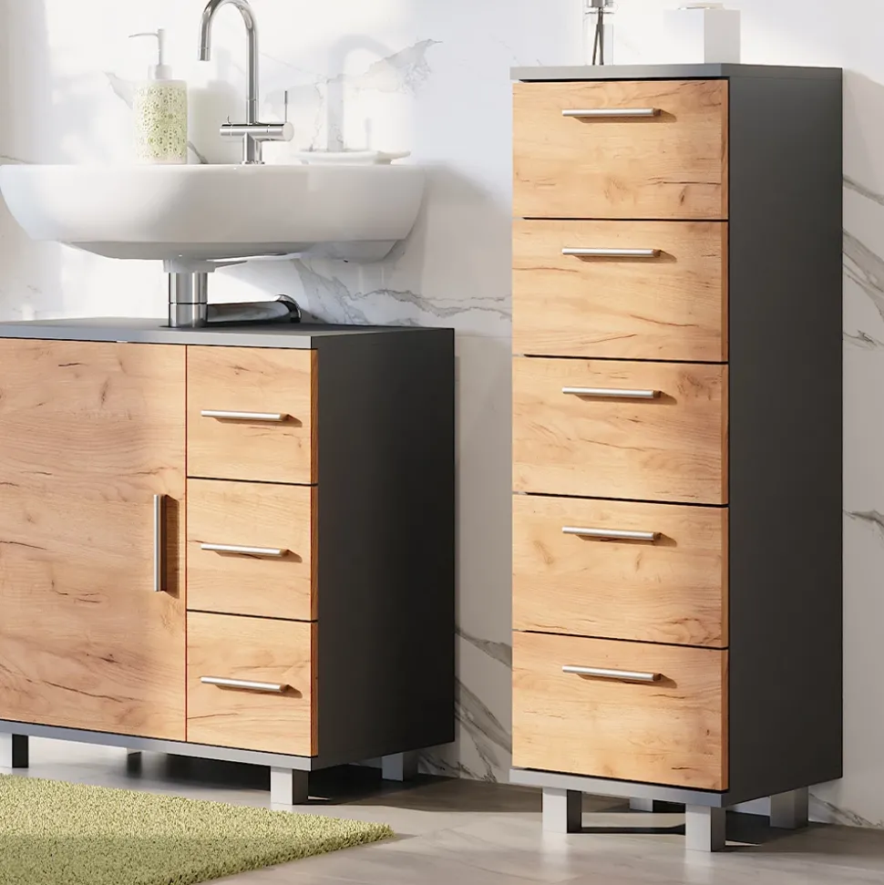 - Das Badezimmerschrank mit Schubladen ist ideal für kleinere Badezimmer. Durch die fünf Schubladen bietet es reichlich Stauraum und ist dabei platzsparend.