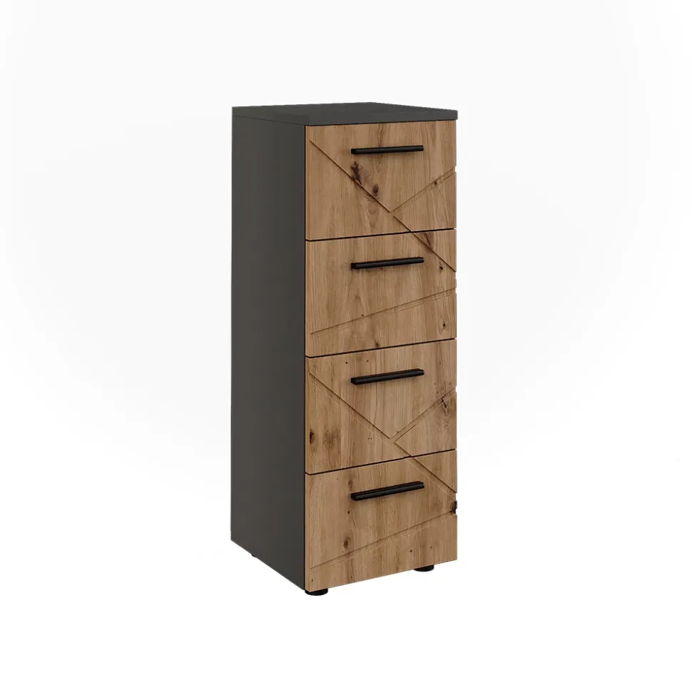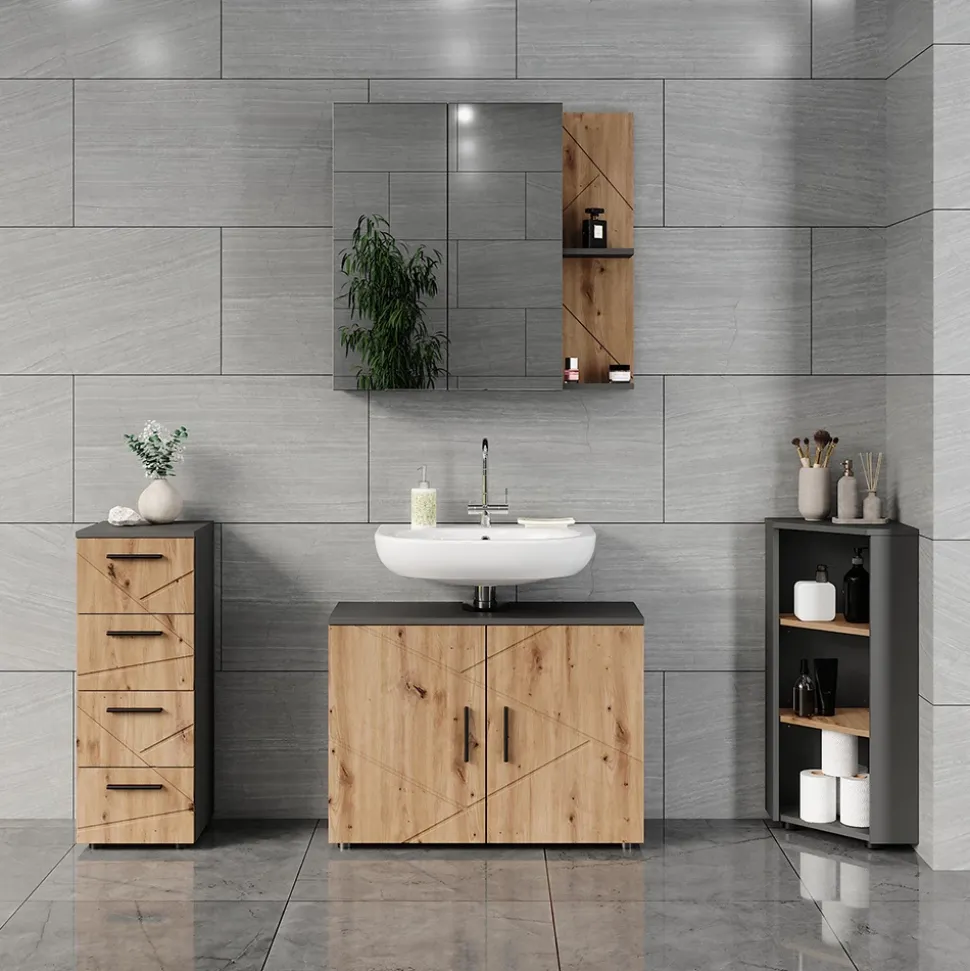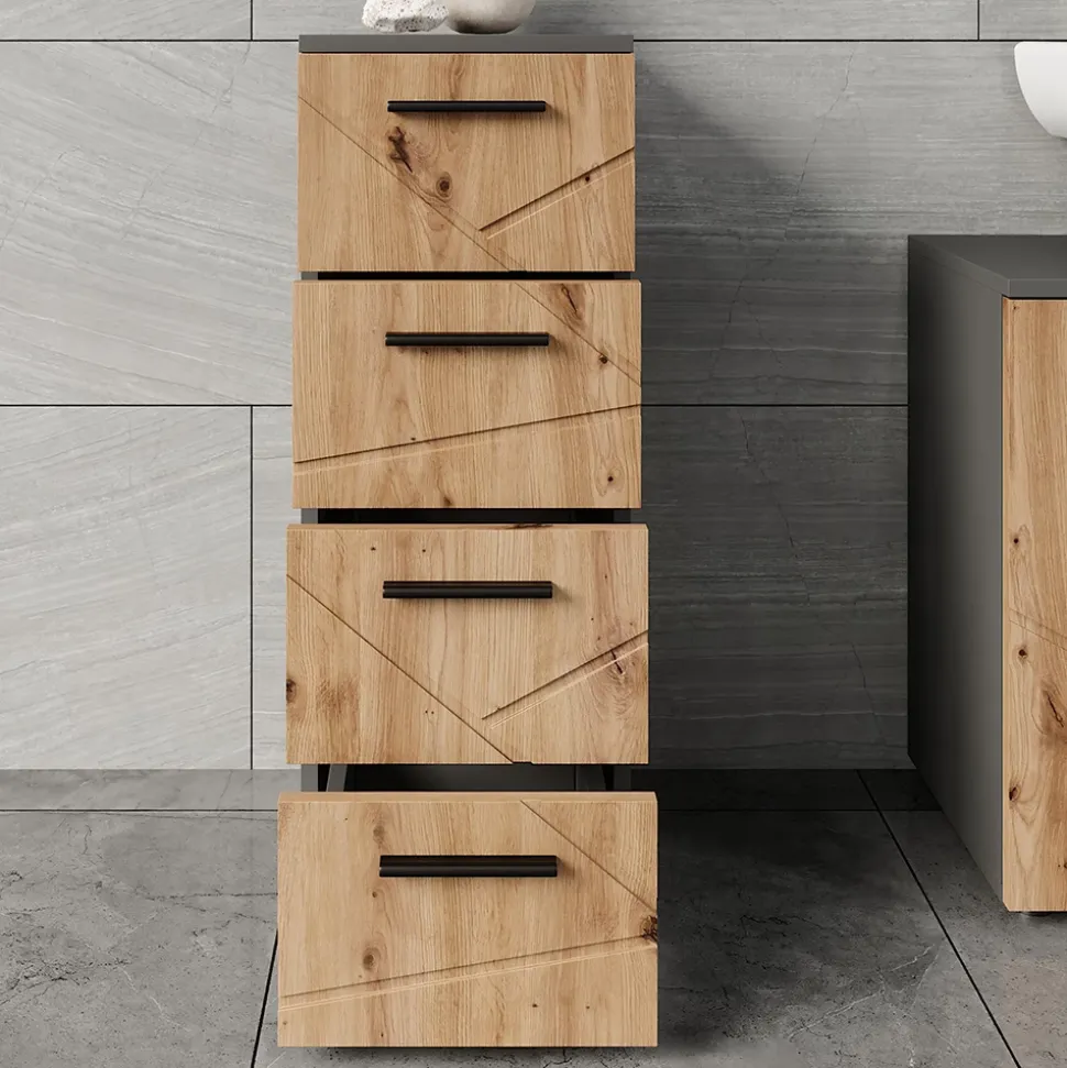 Der Badschrank „Irma“ ist der ideale Begleiter für Ihr Badezimmer. Mit vier geräumigen Schubladen bietet er großzügigen Stauraum für all Ihre Utensilien – von Handtüchern bis hin zu Pflegeprodukten. Dank seines zeitlosen Designs fügt sich der Midischrank harmonisch in jedes Badezimmer ein und lässt sich vielseitig einsetzen. Sparen Sie Platz und halten Sie Ihr Bad ordentlich und übersichtlich – mit „Irma“. Machen Sie Ihr Badezimmer zu einer Wohlfühloase und schaffen Sie mit diesem stilvollen Schrank eine harmonische Atmosphäre.