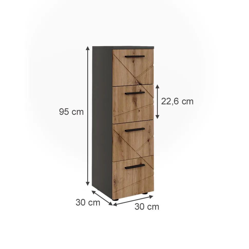 - MAßE: Das Badezimmermöbel hat folgende Abmessungen: Breite 30 cm, Höhe 95 cm, Tiefe 30 cm. Detaillierte Maßangaben sind auf den Produktfotos ersichtlich.