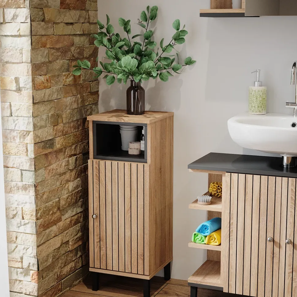 - Entdecken Sie den Vicco Midischrank Aquis in Sonoma-Anthrazit. Ein moderner Badezimmerschrank für stilvolle Aufbewahrung. Schmales Design – eine perfekte Ergänzung als Badregal für Ihr Badezimmer.
