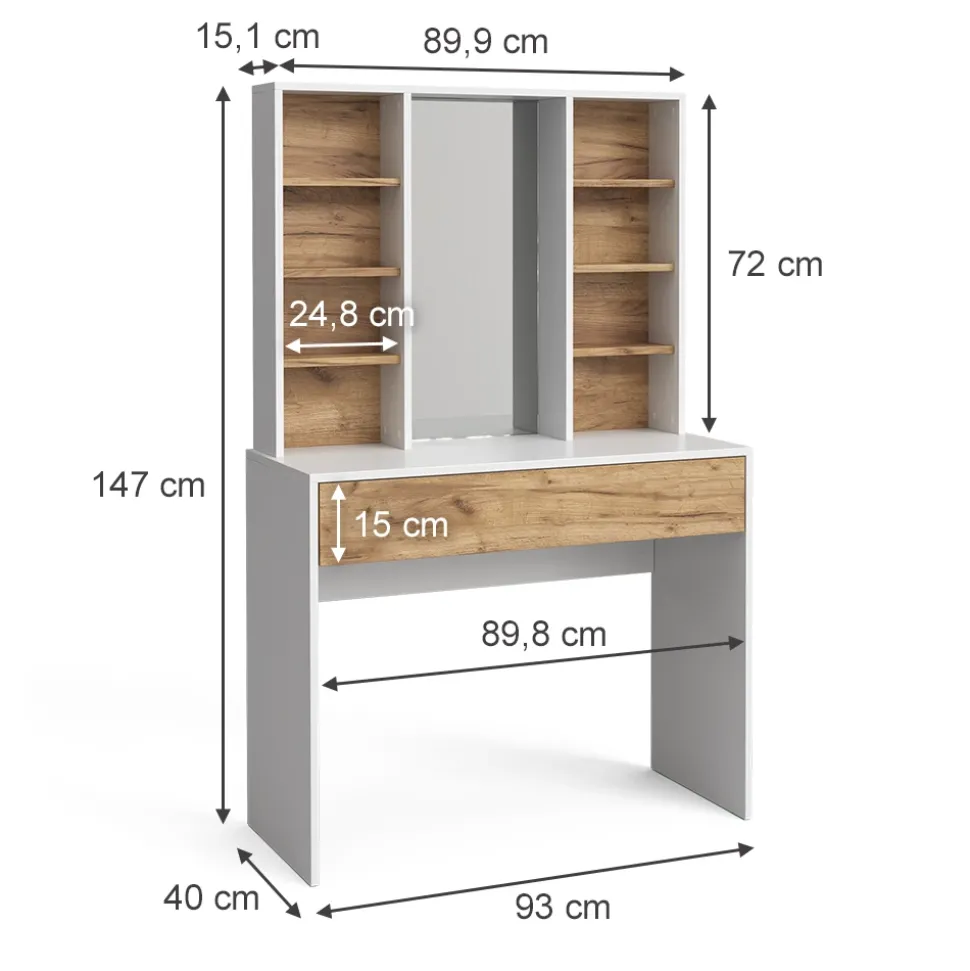 - Entdecken Sie unsere elegante Schminkkommode Alexa mit Spiegel im zeitlosen Weiß-Eiche – Dekor. Ein stilvoller Frisiertisch für Ihr perfektes Styling.