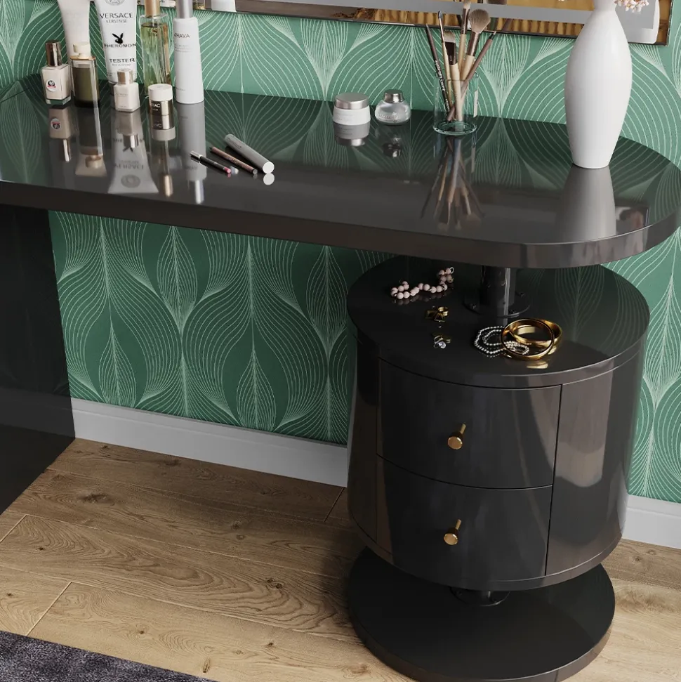 Mit dem Schminktisch Lara wird das tägliche Schminken zu einem einzigartigen Erlebnis. Durch das futuristische Design ist dieser Frisiertisch ein echter Hingucker in jedem Raum. Mit zwei geräumigen Schubladen und einer großzügigen Schminktischplatte bietet der Tisch ausreichend Stauraum für all Ihre Schminkutensilien. Dieses Modell ist in verschiedenen Set-Angeboten erhältlich und verleiht jedem Raum das gewisse Etwas. Gönnen Sie sich den Schminktisch Lara und verwandeln Sie Ihr Zuhause in eine Oase der Schönheit.