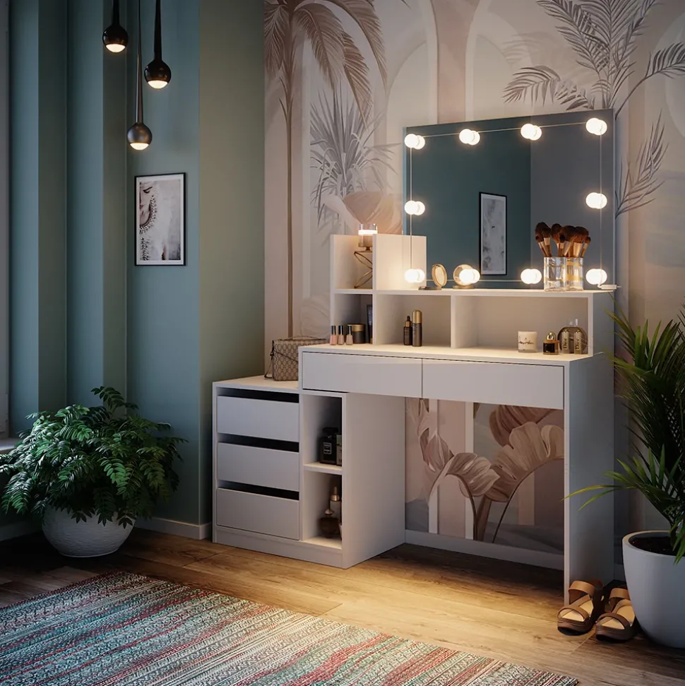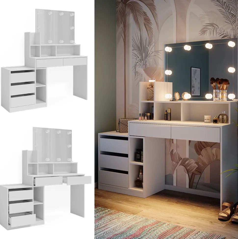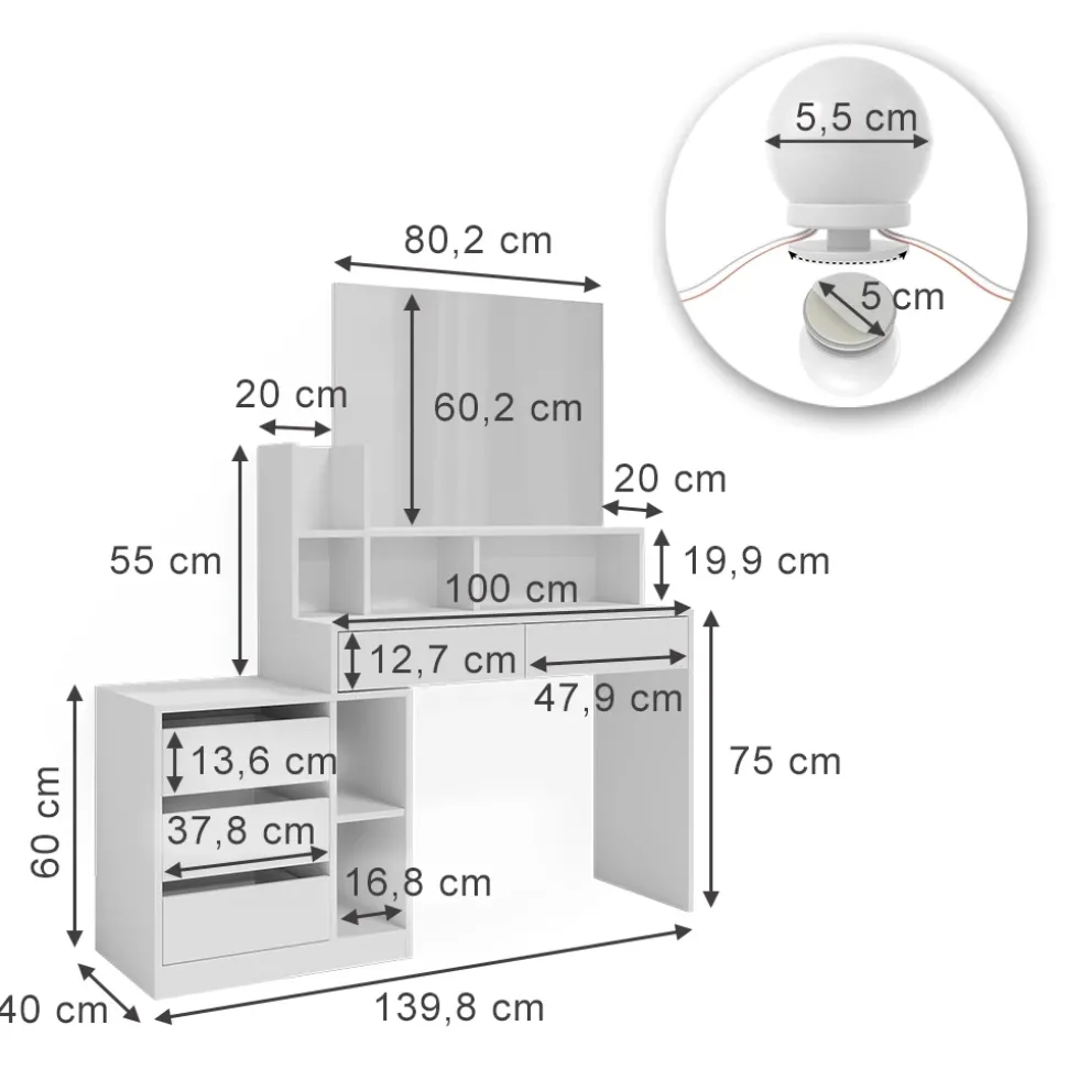 - MATERIAL: Schminktisch: Spanplatte, 16 mm. Spiegel: Glas. LED-Lichterkette: Kunststoff. Pflege: Sanfte Reinigung, geeignete Mittel.
