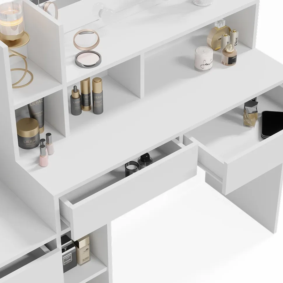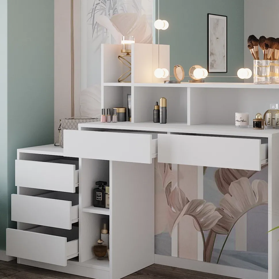 - Der Kosmetiktisch mit Spiegel verfügt über praktische Ablageflächen und Schubladen für die Aufbewahrung von Kosmetika und Schmuck.