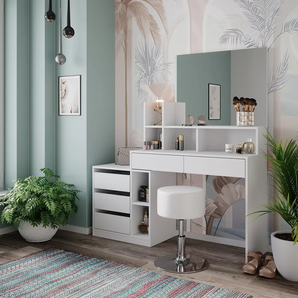 - MATERIAL: Der Schminktisch besteht aus pflegeleichter Spanplatte, 16 mm, Melaminharzbeschichtung.