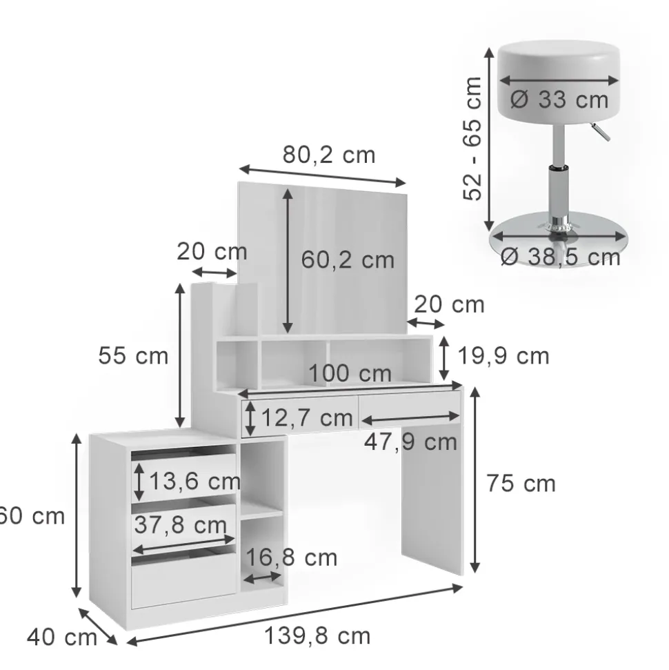 - MAßE: Der FrisiertischTiefe: 40 cmBreite: 139,8 cmHöhe: 115 cm