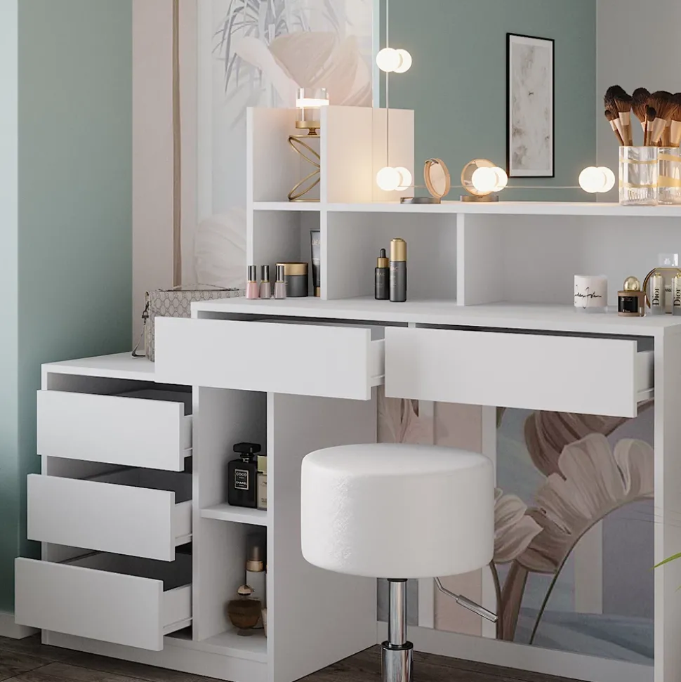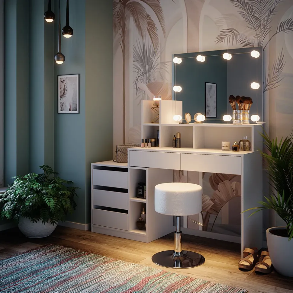 - Entdecken Sie unsere Frisierkommode Anja in strahlendem Weiß mit großem Spiegel. Inklusive LED-Lampe, Hocker und Kosmetiktisch für Ihre perfekte Beauty-Routine.