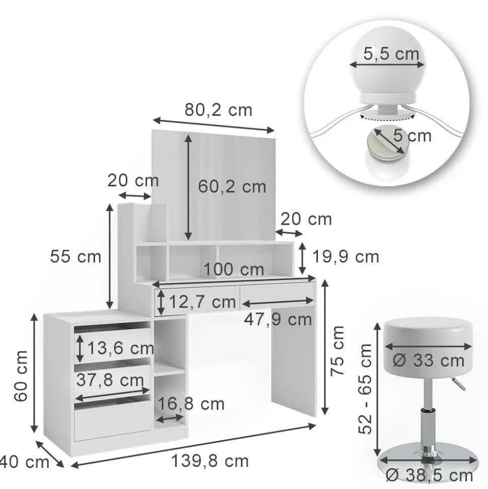 - MAßE: 139,8 x 115 x 40 cm (BxHxT), Spiegel: 80,2 x 60,3 cm (BxH), 52 kg. LED-Lichterkette: Ø LED-Kugel 5 cm, Gesamt: 400 cm (L), Stromkabel: 120 cm; 400 g. Hocker: Sitzhöhe: 52–65 cm (H), 4,7 kg