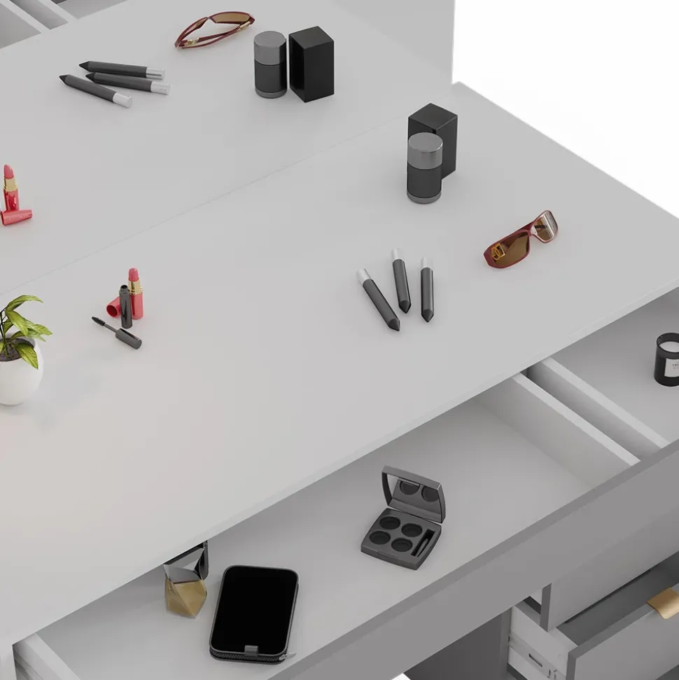 - Erleben Sie den modernen Vicco Schminktisch Elise in Weiß-Grau für stilvolles Styling im Schlafzimmer. Mit Schubladen und Spiegel für Ihre Make-Up-Bedürfnisse.