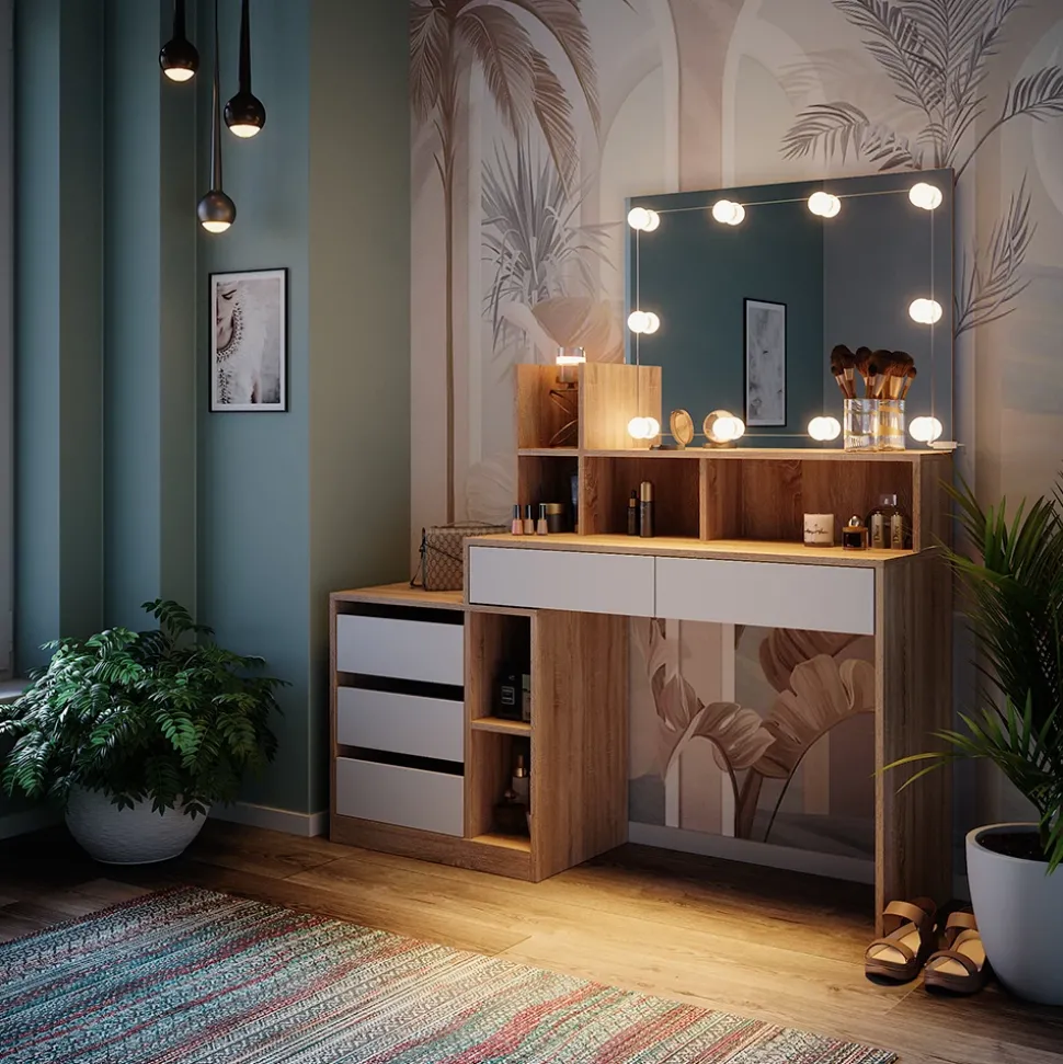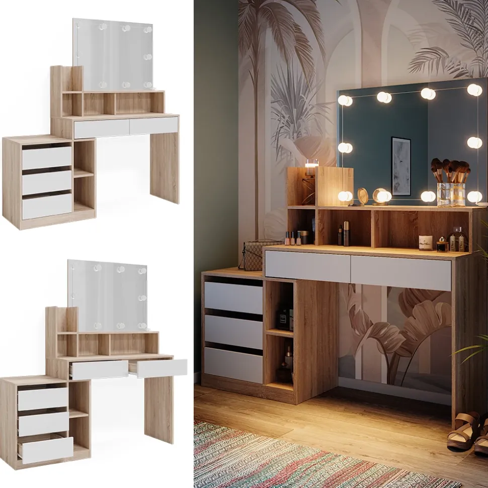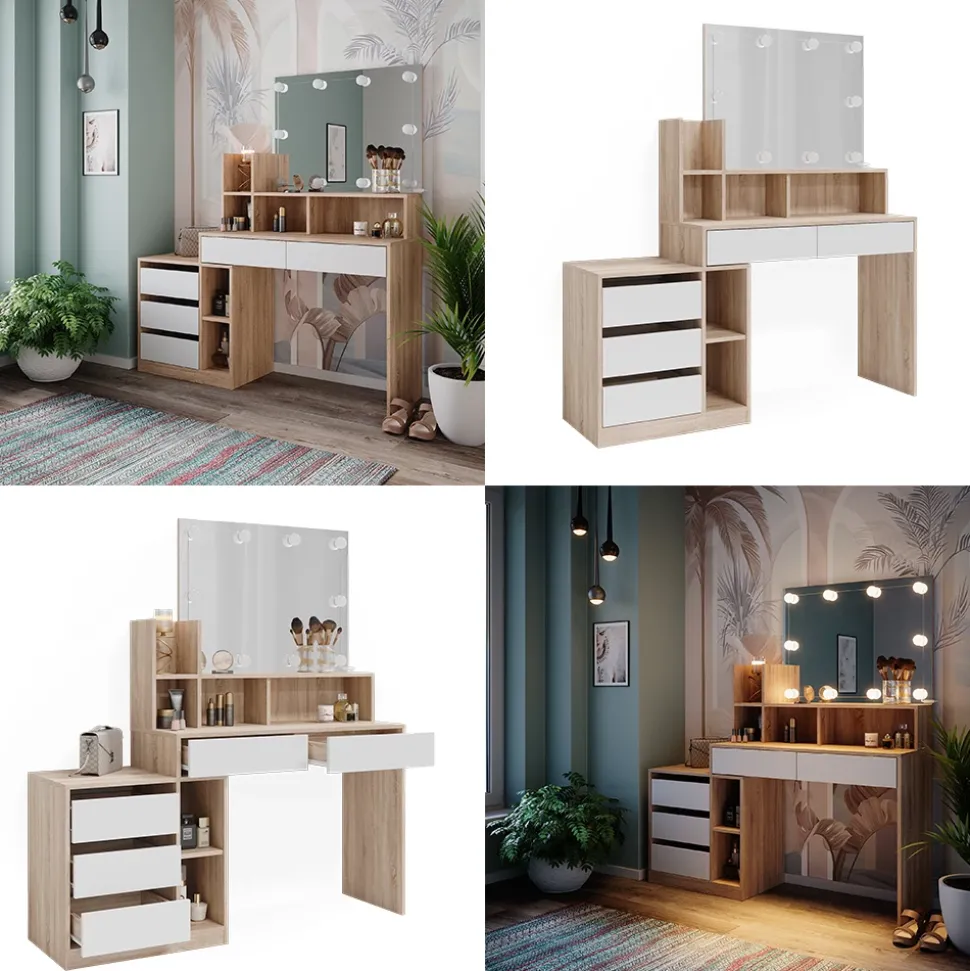 - Der Kosmetiktisch mit Spiegel bietet praktische Aufbewahrungsfächer und eine integrierte Beleuchtung für optimales Make-up. Das elegante Design sorgt für ein stilvolles Ambiente in jedem Raum.
