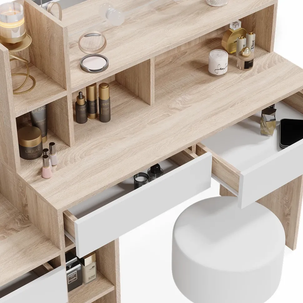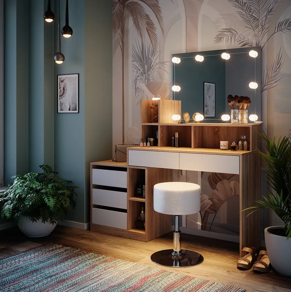 - Der Kosmetiktisch mit Spiegel bietet praktische Aufbewahrungsmöglichkeiten und eine integrierte Beleuchtung für ein perfektes Make-up-Ergebnis.