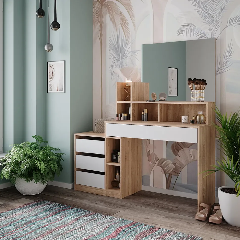 - MATERIAL: Der Schminktisch besteht aus pflegeleichter Spanplatte, 16 mm, Melaminharzbeschichtung.