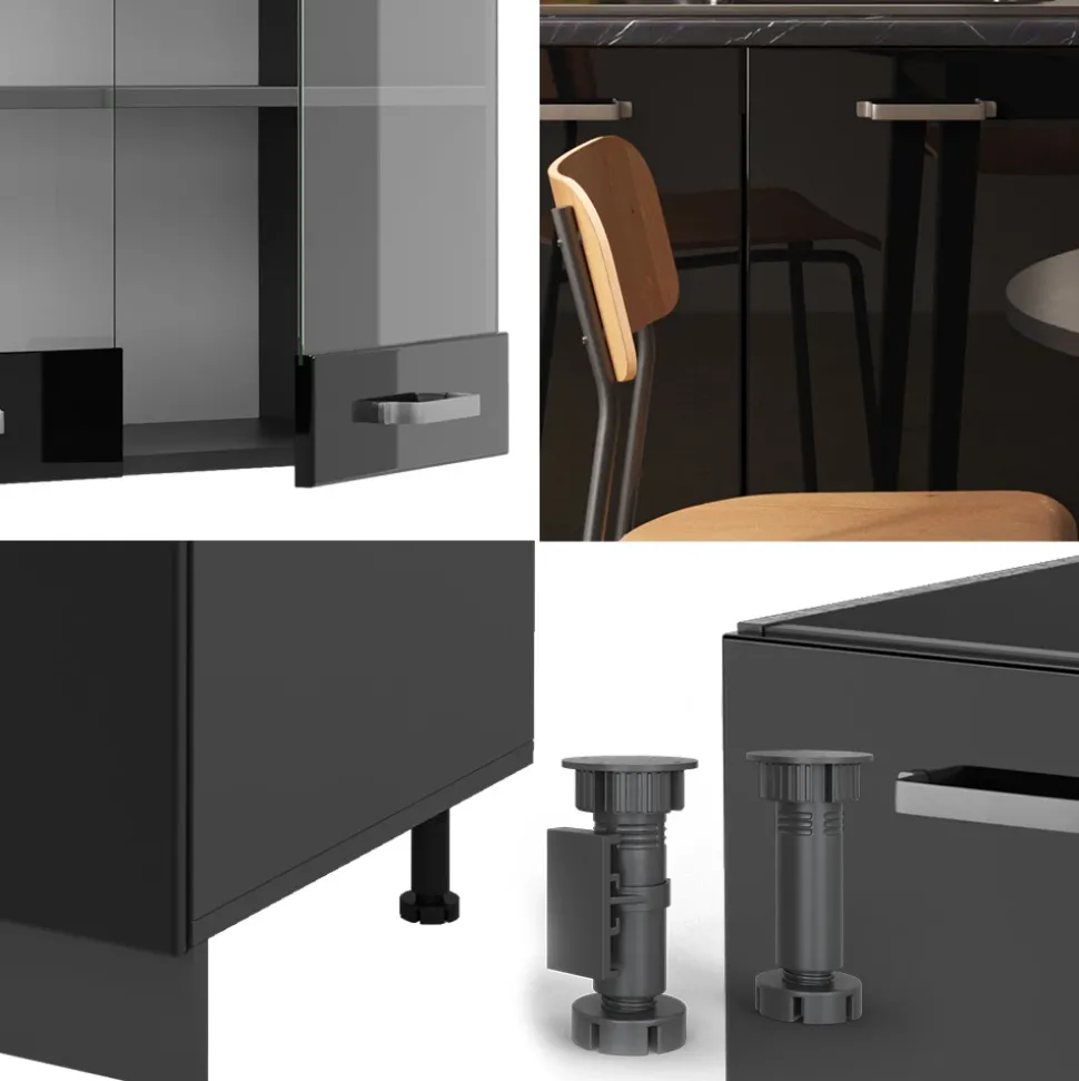 - Die Küchenzeile ist modular aufstellbar und kann je nach Bedarf erweitert werden. Dank höhenverstellbarer Füße ist ein individuelles Anpassen möglich.